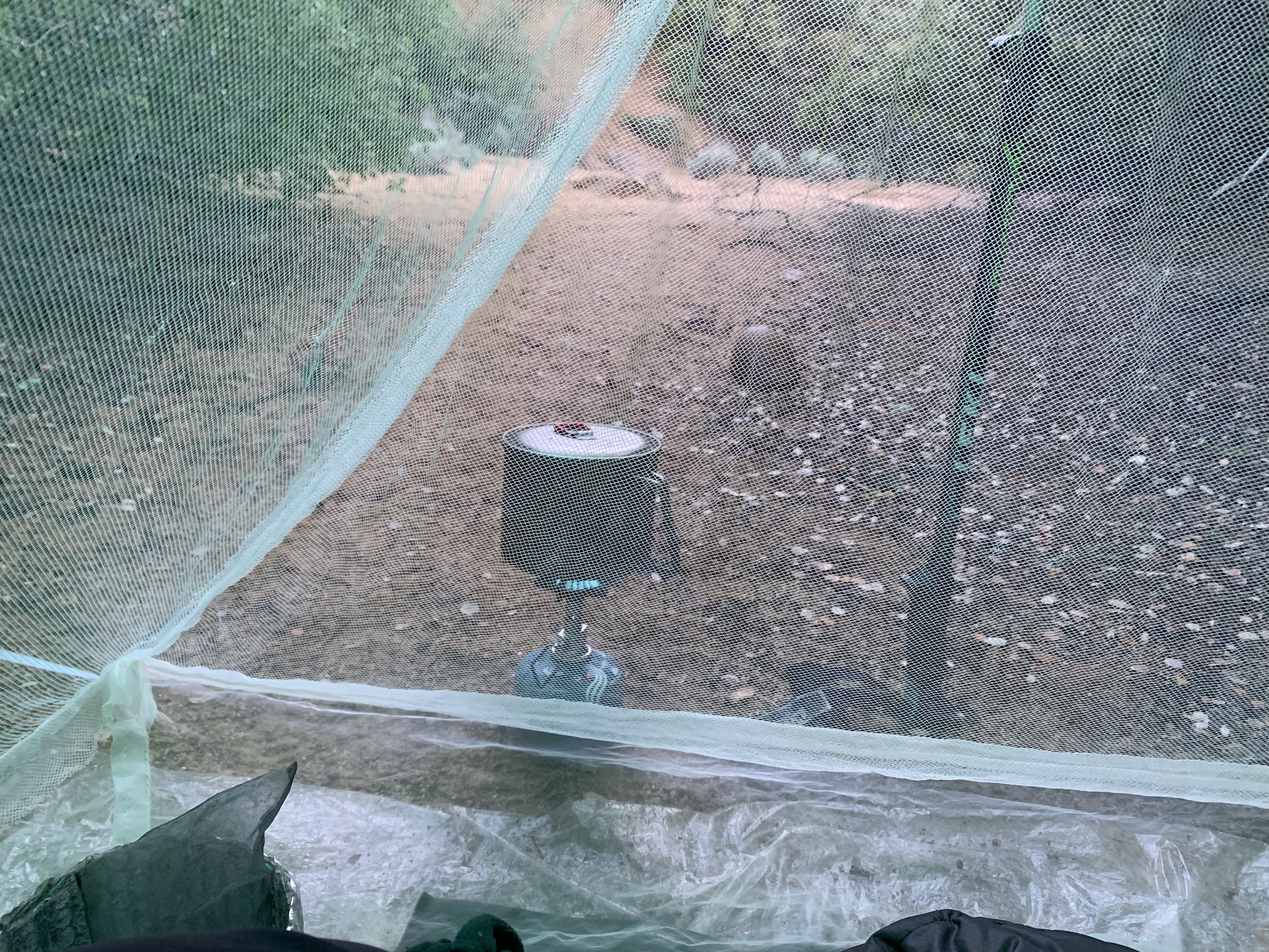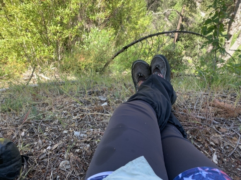 I took a little break for lunch. To handle pushing through all the brush, I had covered my legs with tights and had been wearing my rain jacket and a lycra balaclava so that nothing was exposed to the brush and could get caught. Not my hair, not my skin, not my ears. It was pretty hot and uncomfortable.
