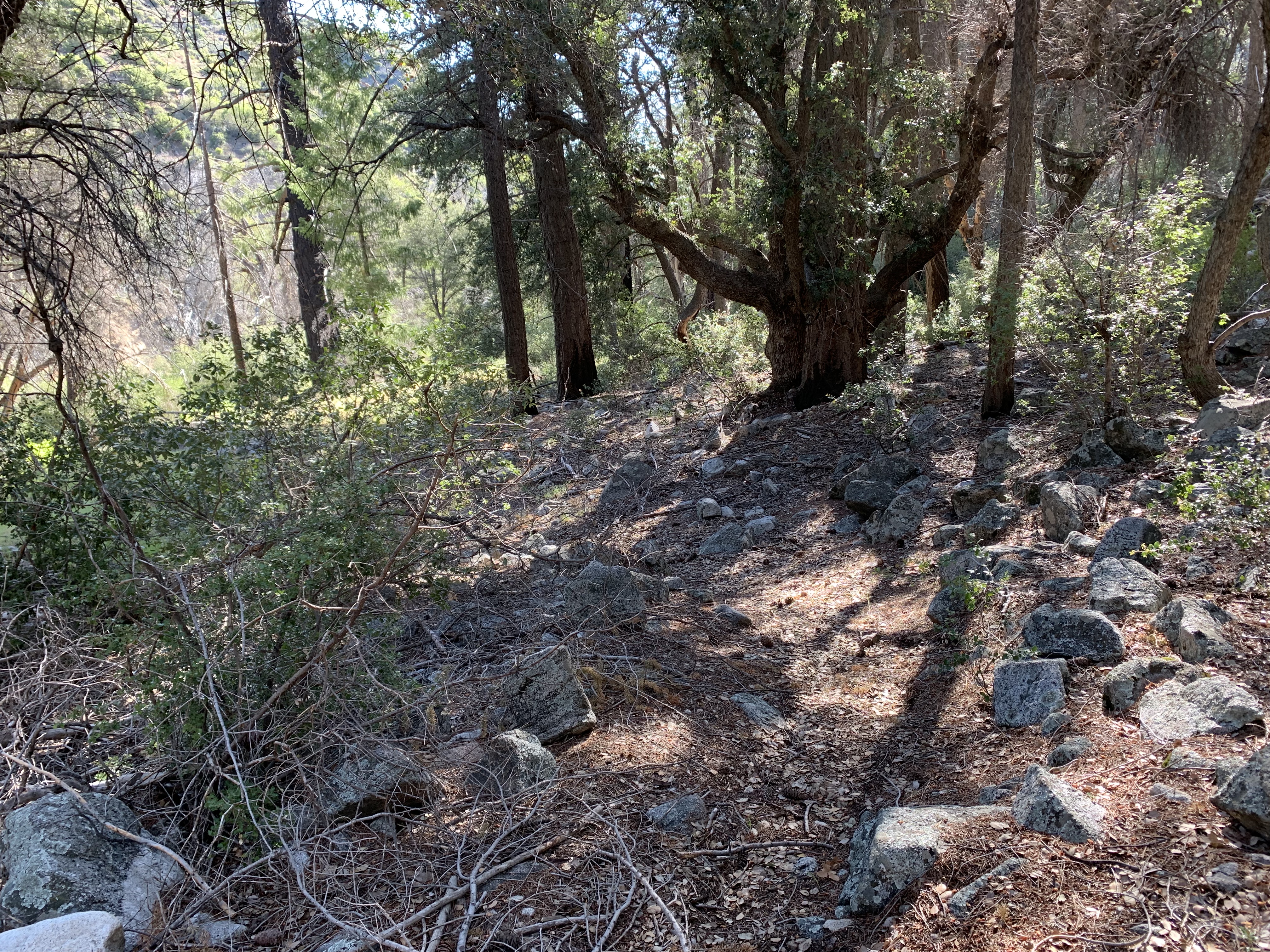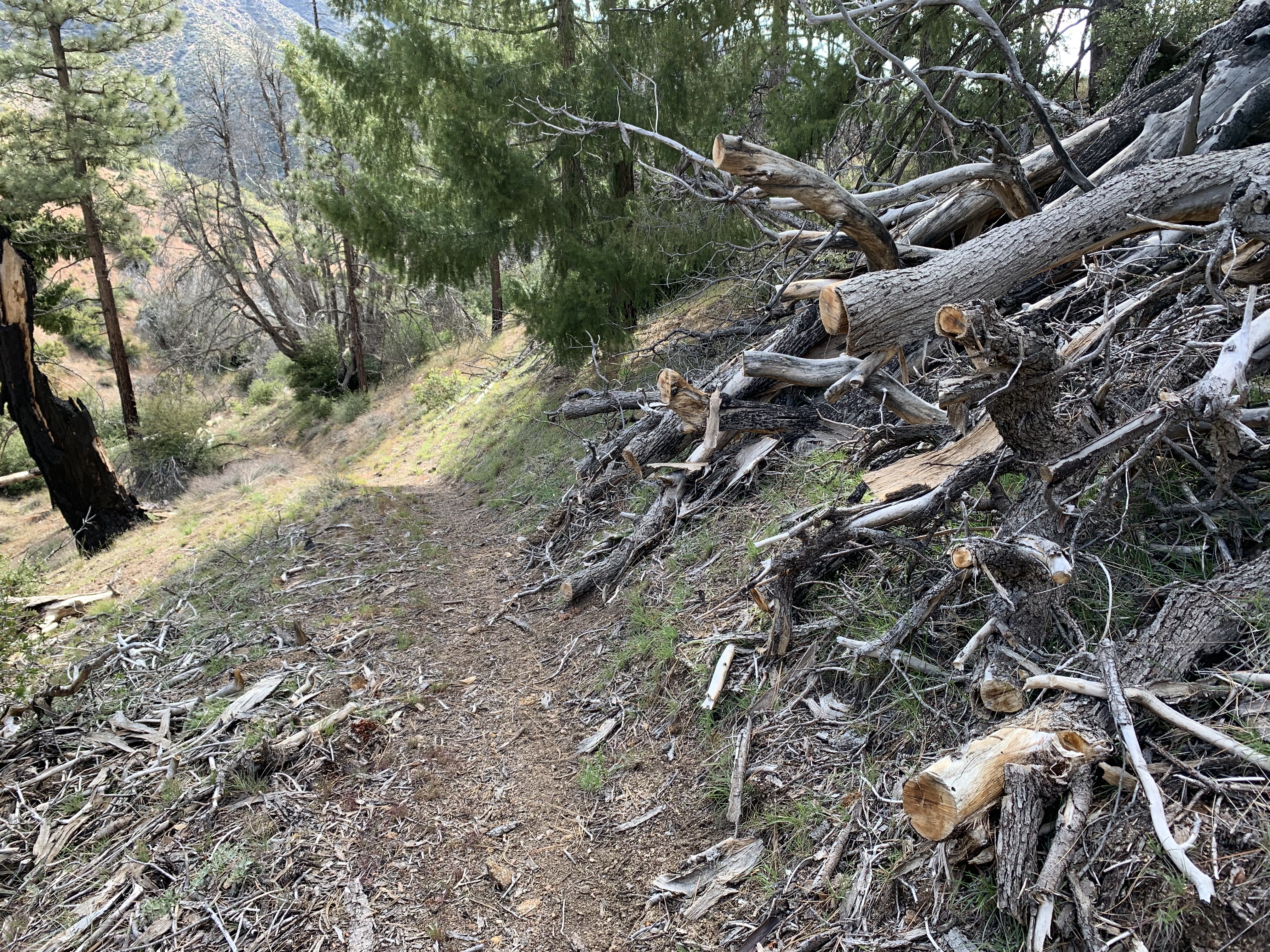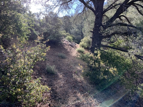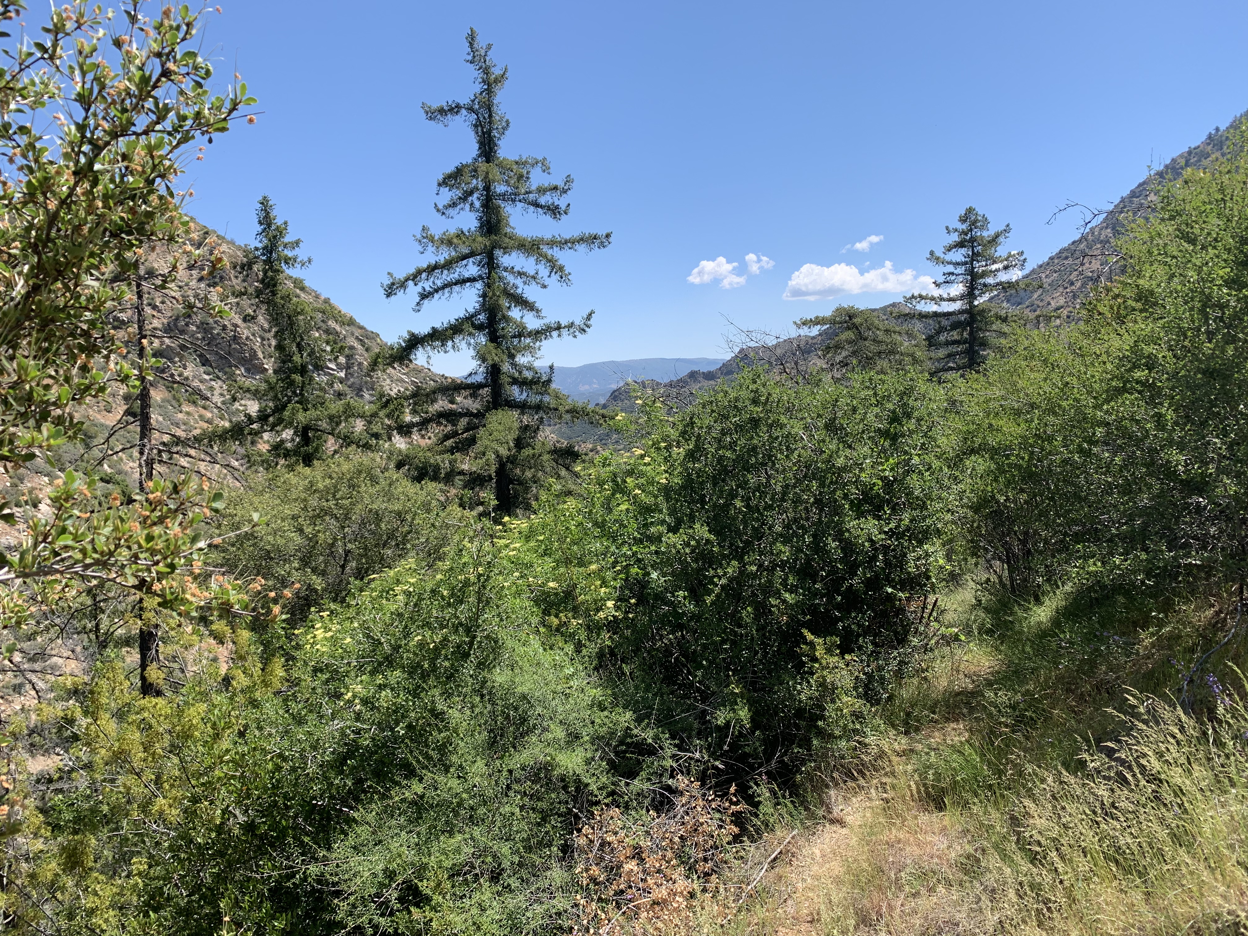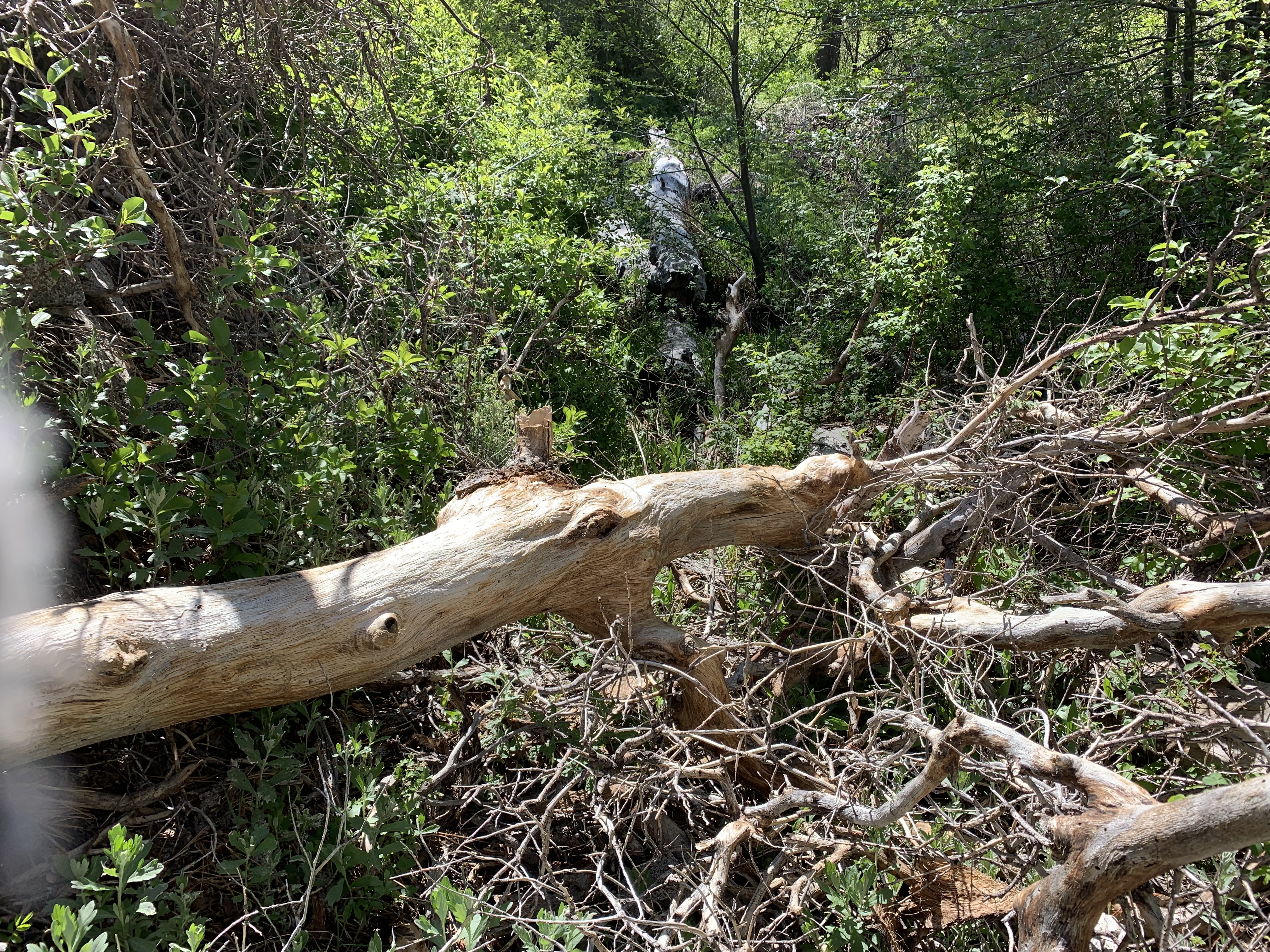 Somewhere around here I went the wrong way again and got lost. This looked like good trail but I think I was supposed to cross the creek to better trail. I ended up fighting my way down buck creek, which was not easy at all. I was frequently hopelessly tangled and my overall impression was this trail was obliterated. Now and then I could make pretty good progress, but in other places I couldn't figure out how to get through. It was as though there had been some kind of massive debris flow down the creek.