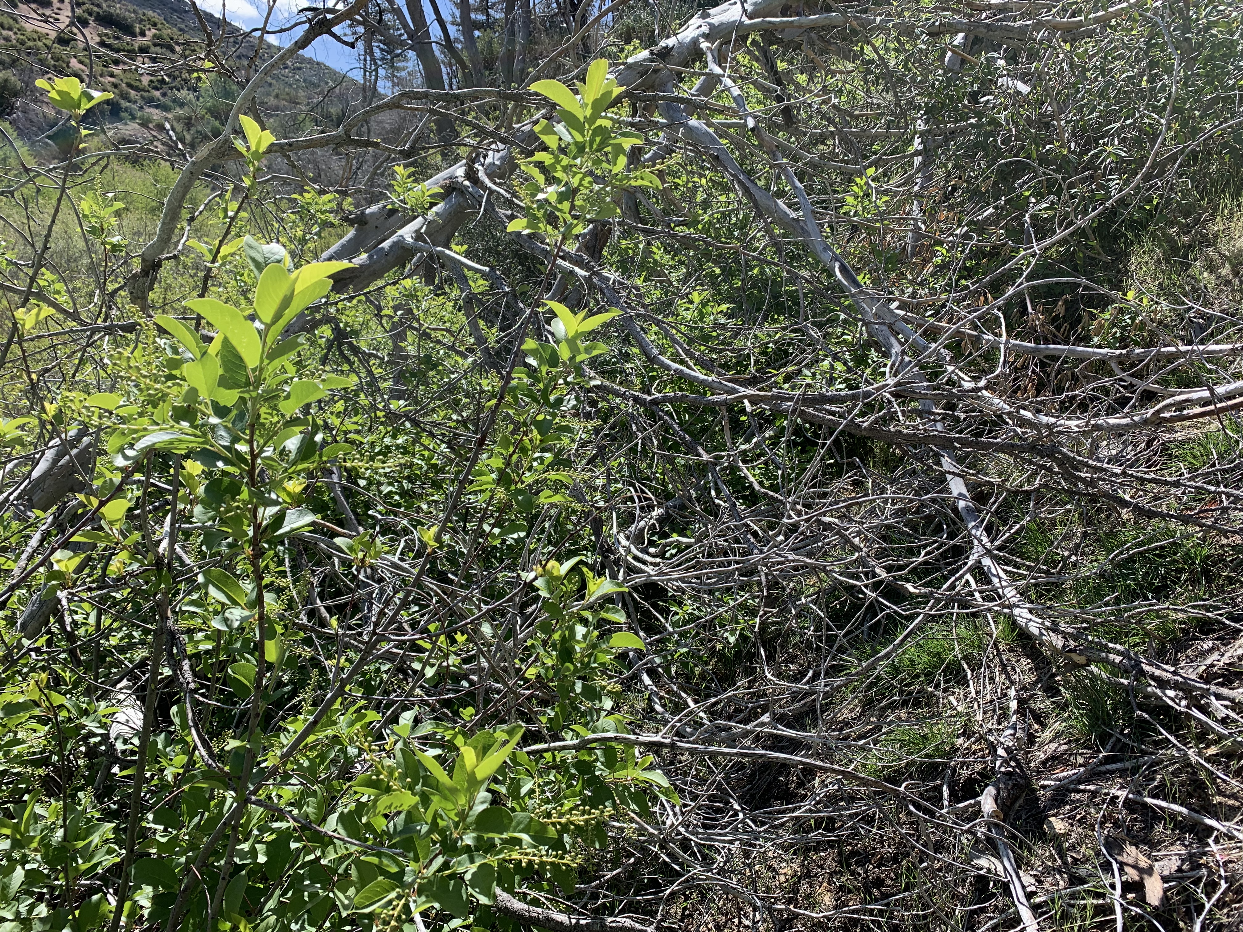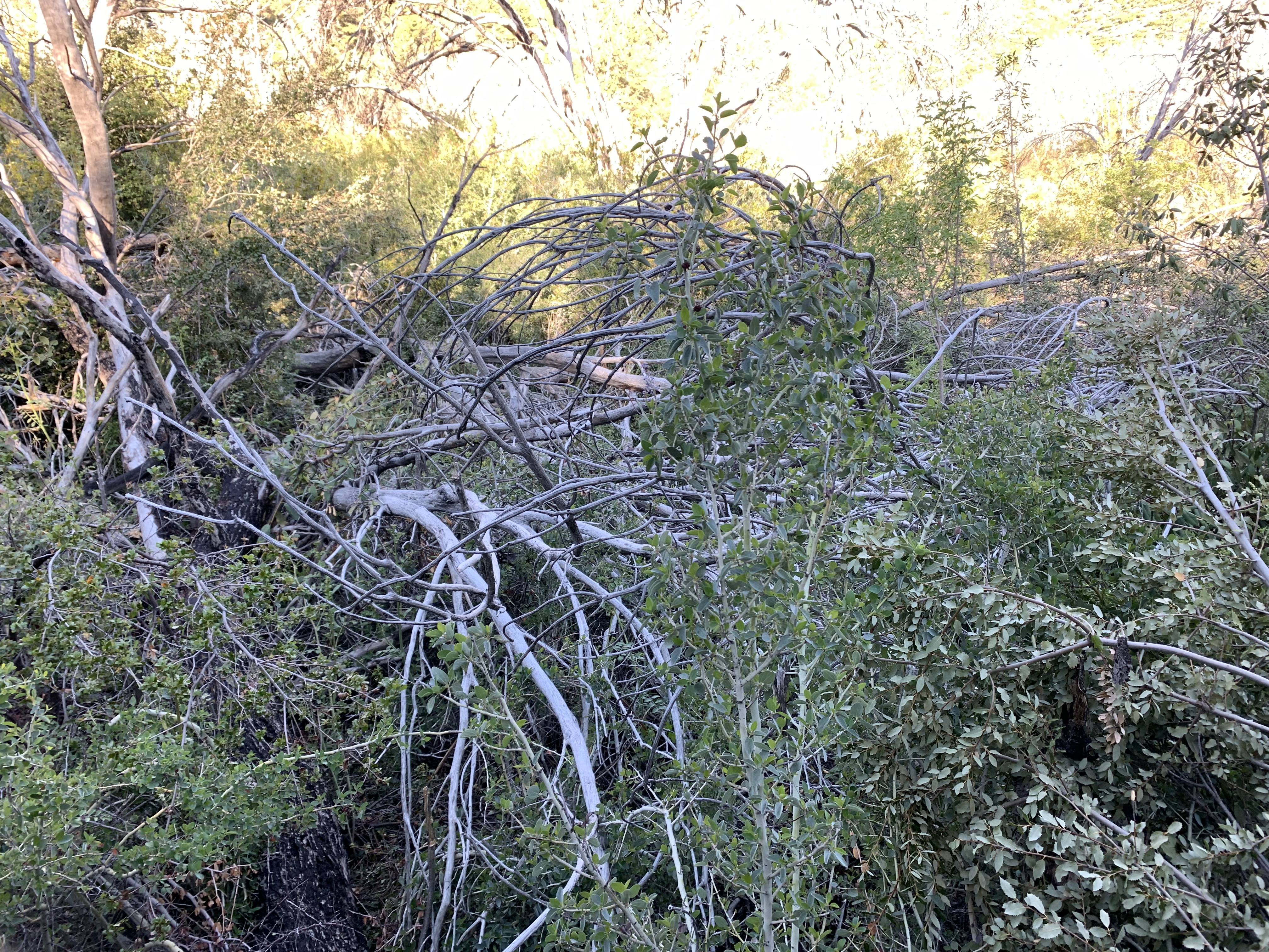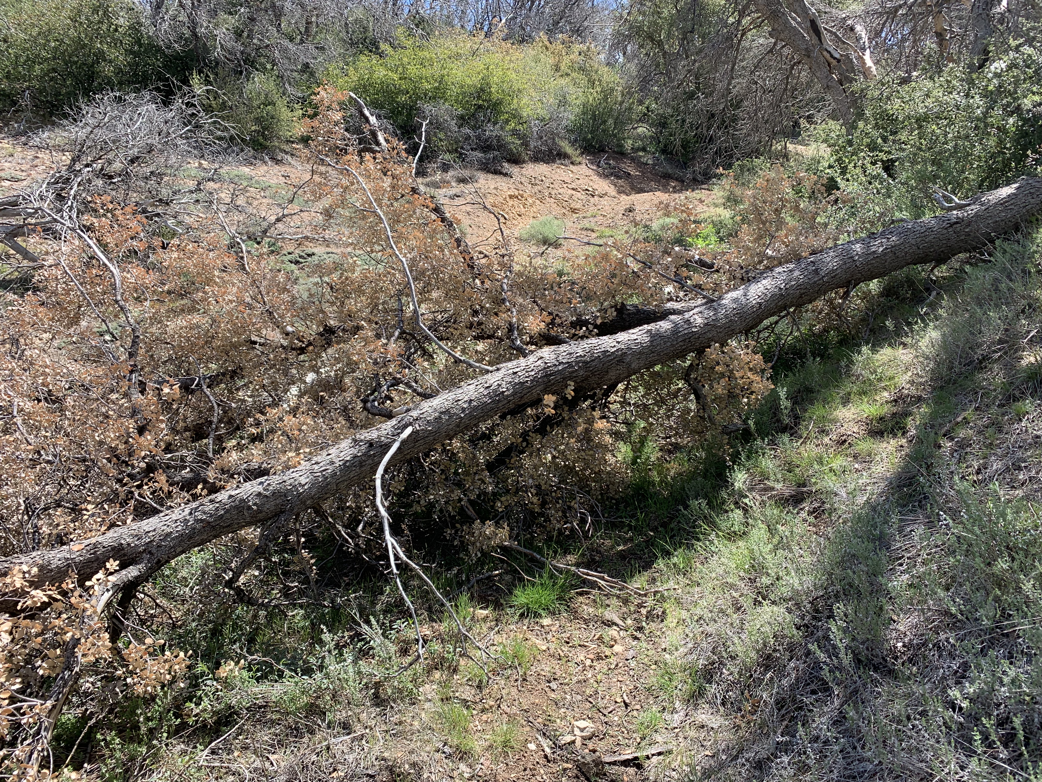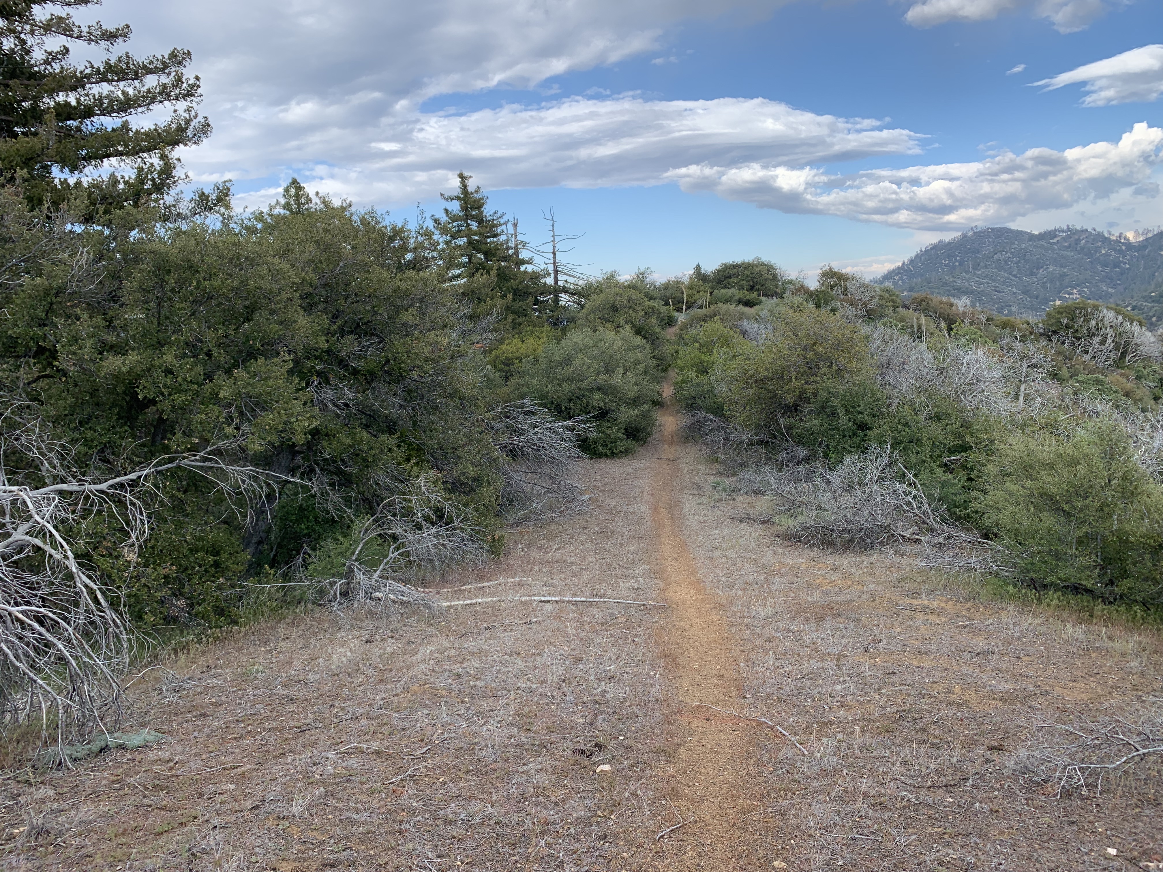 Somewhere around here I went the wrong way again and got lost. This looked like good trail but I think I was supposed to cross the creek to better trail. I ended up fighting my way down buck creek, which was not easy at all. I was frequently hopelessly tangled and my overall impression was this trail was obliterated. Now and then I could make pretty good progress, but in other places I couldn't figure out how to get through. It was as though there had been some kind of massive debris flow down the creek.
