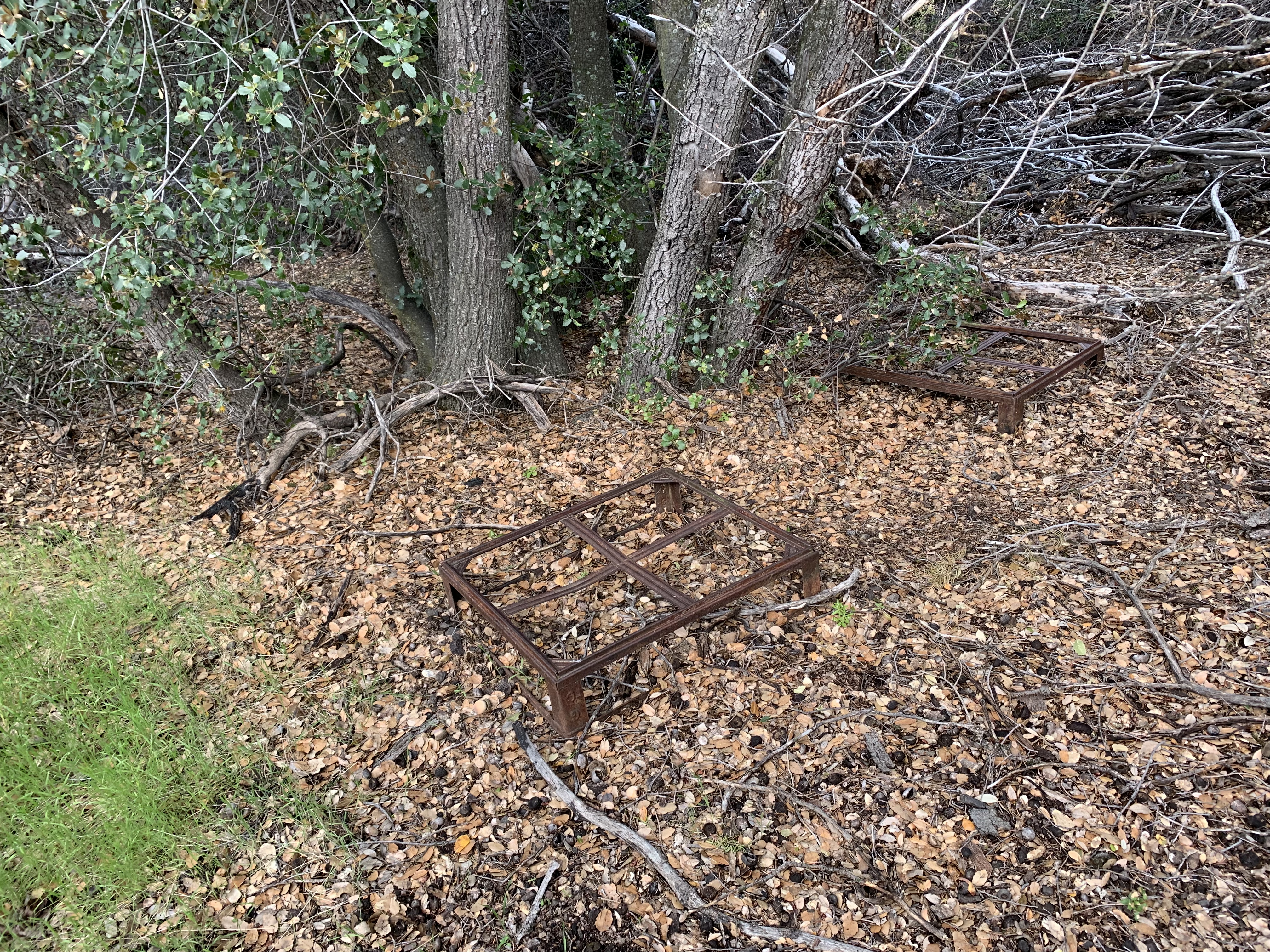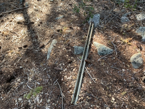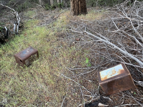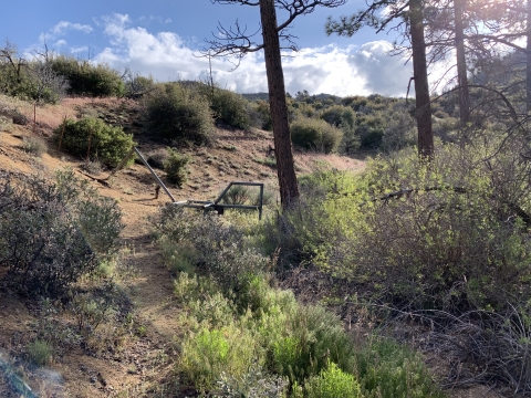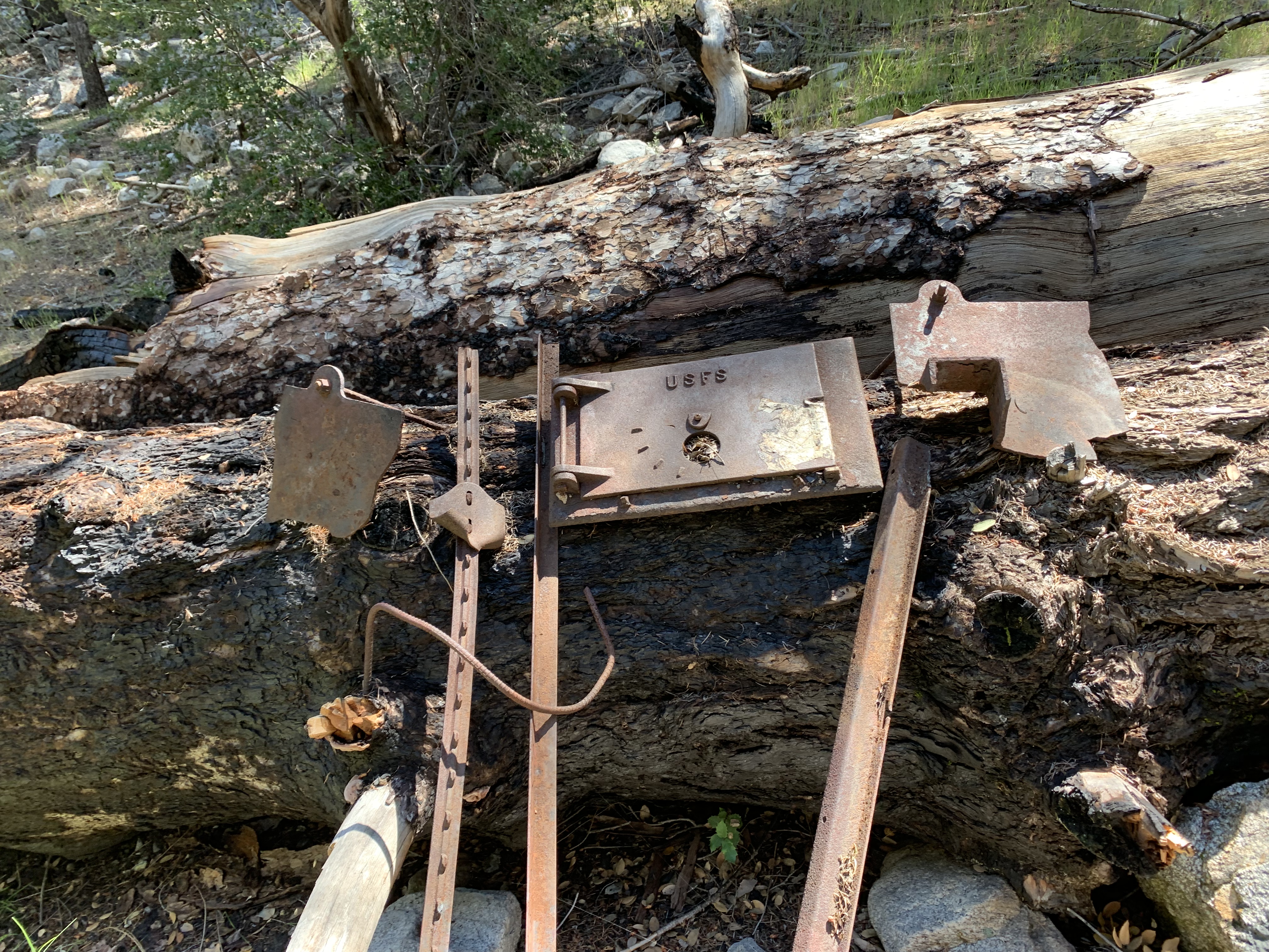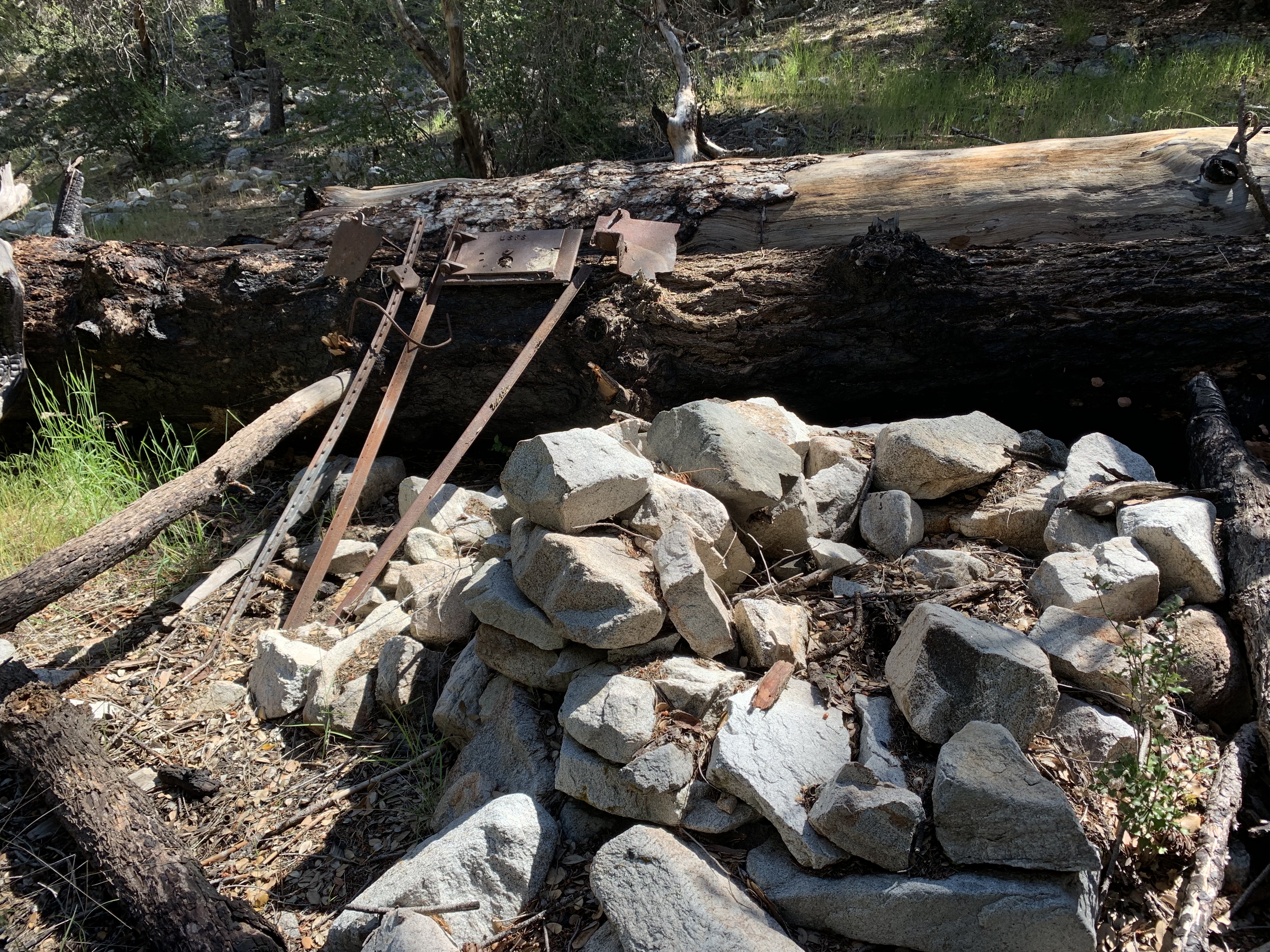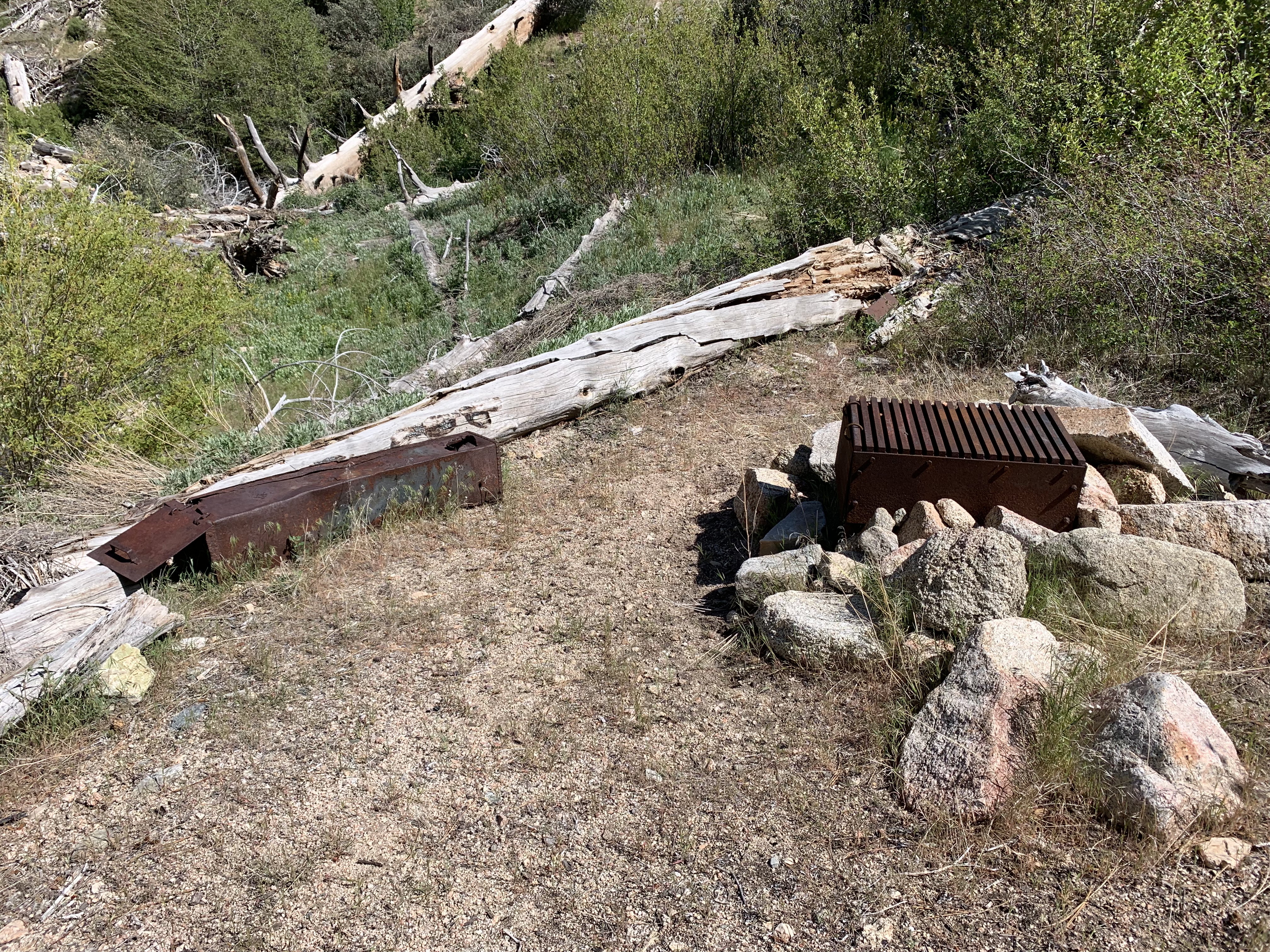 In the morning I was able to easily backtrack to the faint trail and then just walk easily cross-country downhill through the big cone spruce right down to the bottom of the canyon where I found the trail. When I found this metal thing I was really happy. I knew I was going to be okay. The spring had to be close-by.