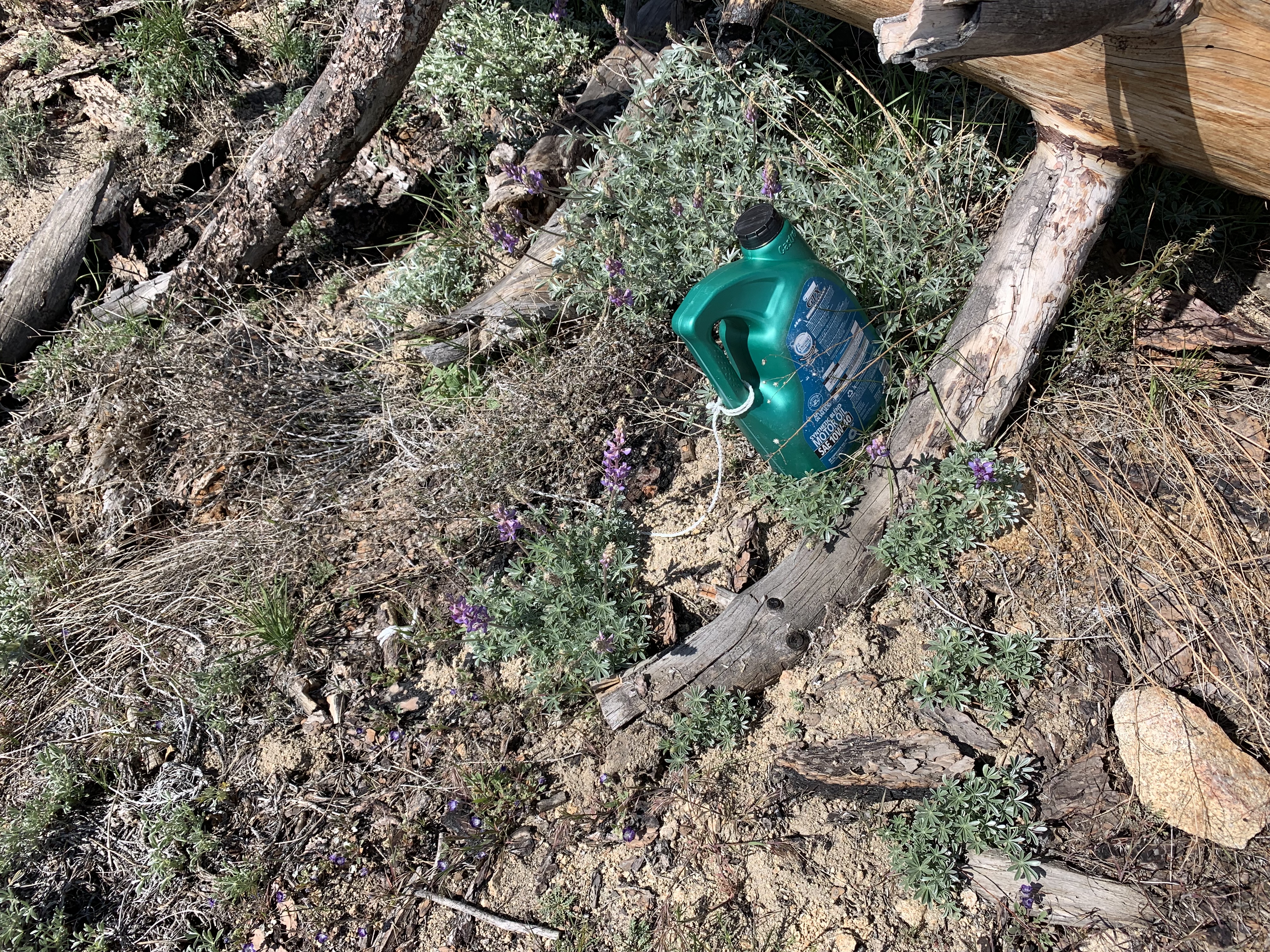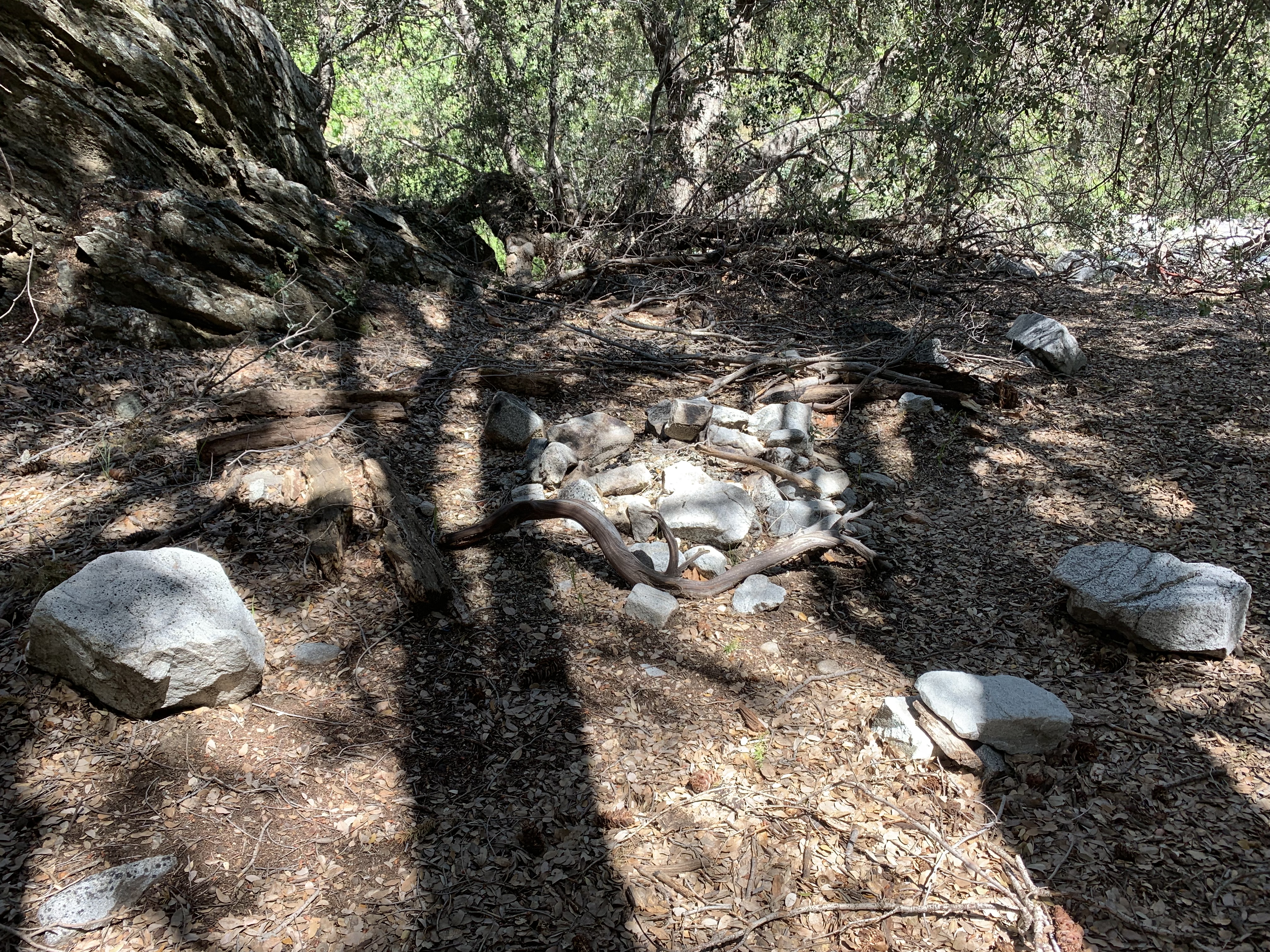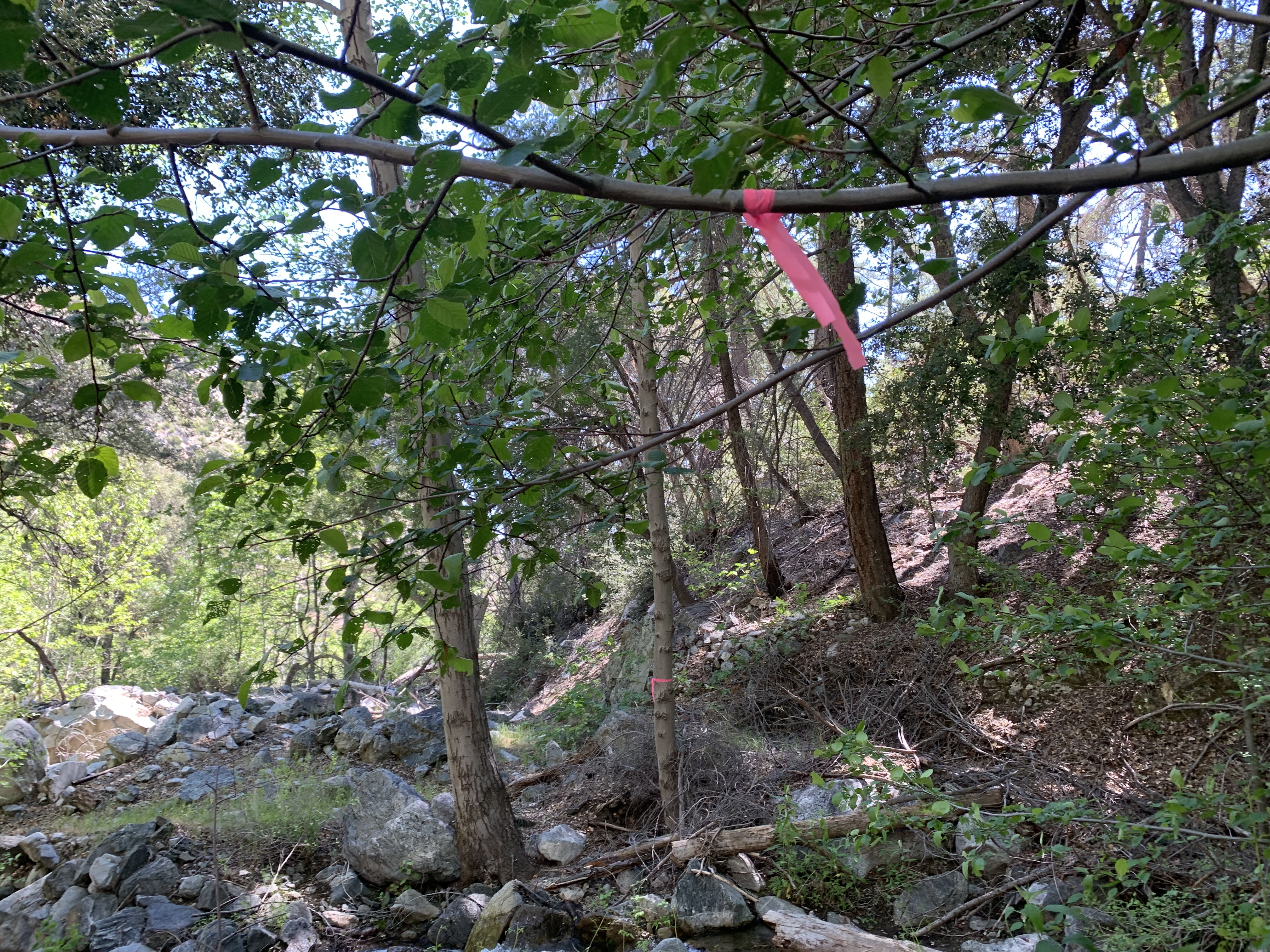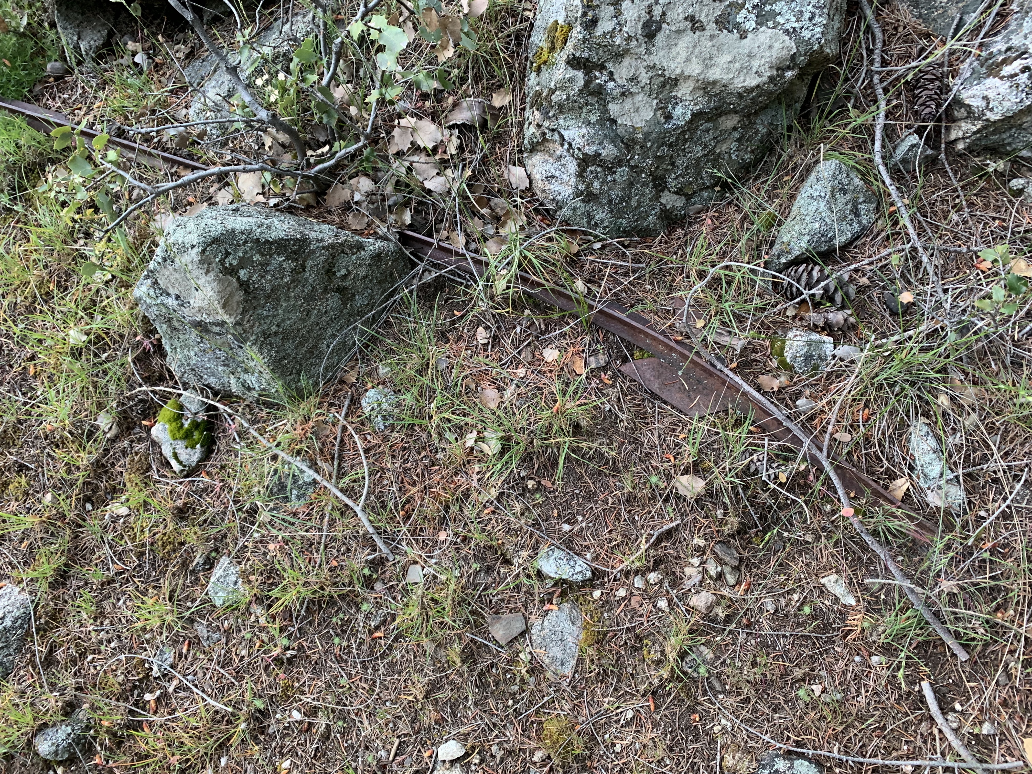 In the morning I was able to easily backtrack to the faint trail and then just walk easily cross-country downhill through the big cone spruce right down to the bottom of the canyon where I found the trail. When I found this metal thing I was really happy. I knew I was going to be okay. The spring had to be close-by.