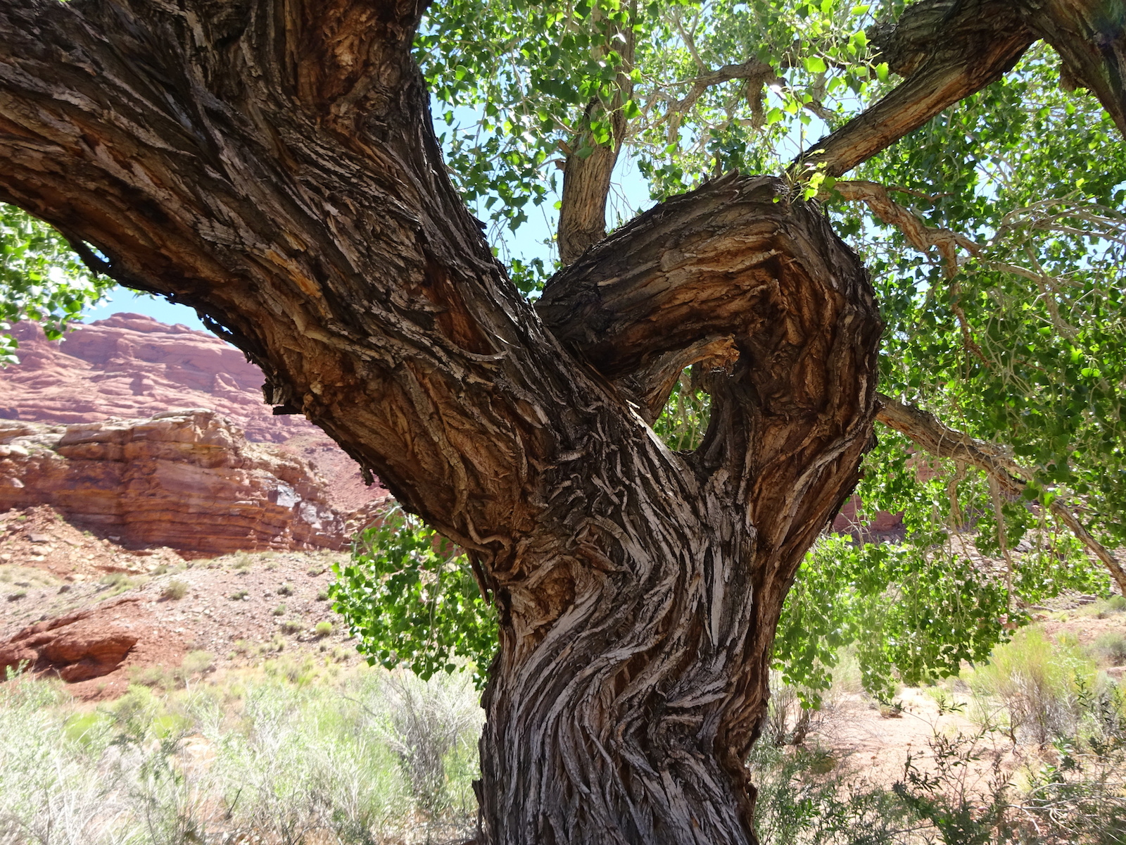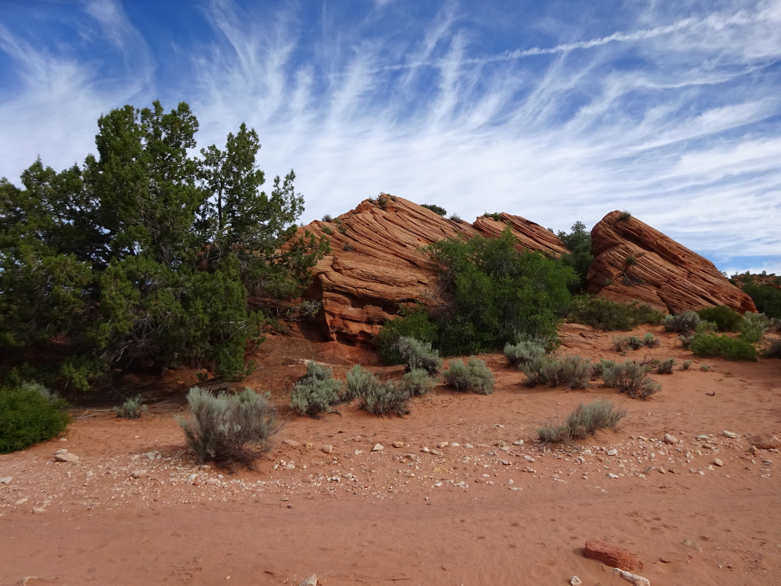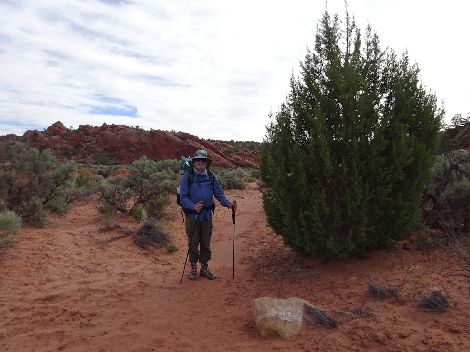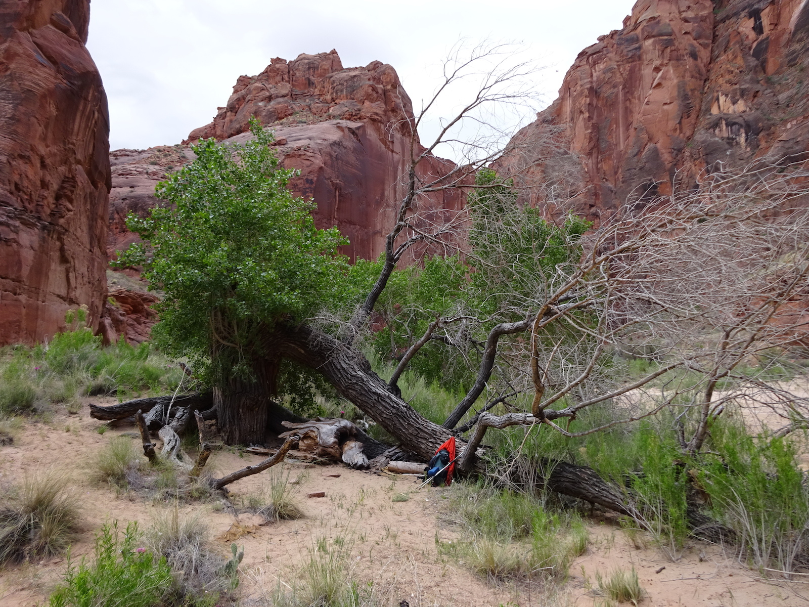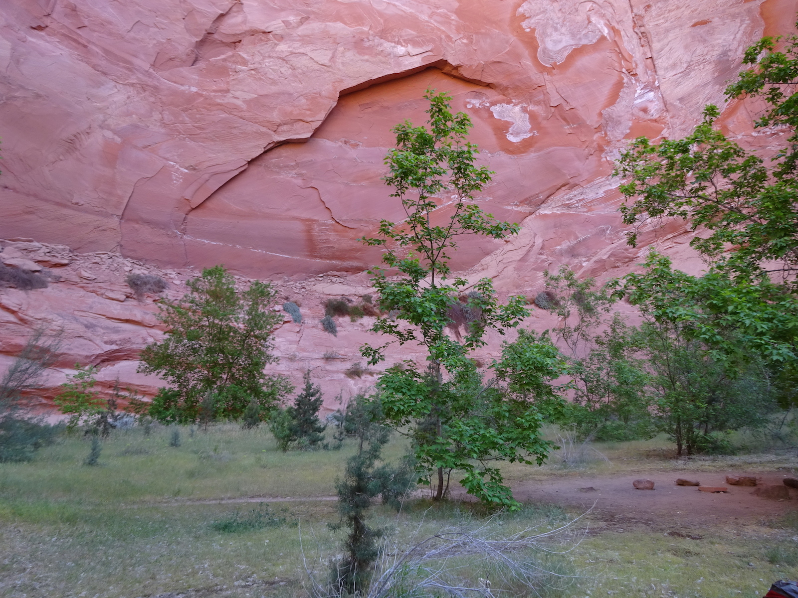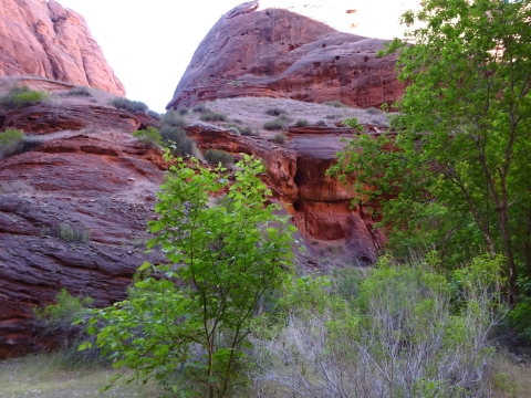 It was a completely flat camp site area with a huge overhanging sandstone wall and what felt sort of like a carpet of moss underfoot. The sand was soft and the evening was mild. You could walk around barefoot easily. There were some cactus growing here, though, so I didn't go barefoot. There were juniper trees like this one and others that we didn't know what they were but their leaves looked sort of oak-like, sort of poison ivy-like, sort of maple-like and the tree itself seemed to occupy a