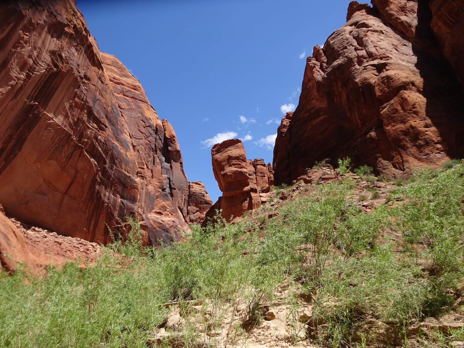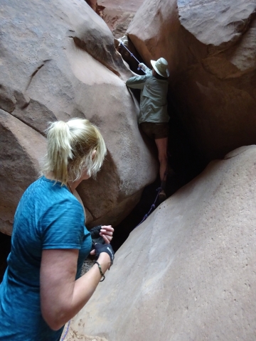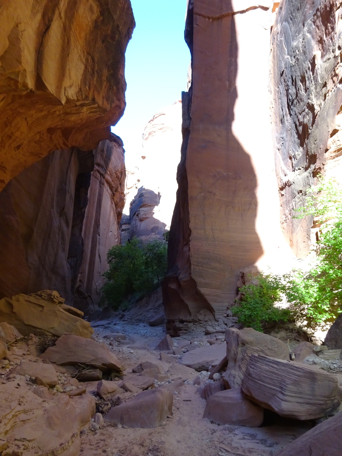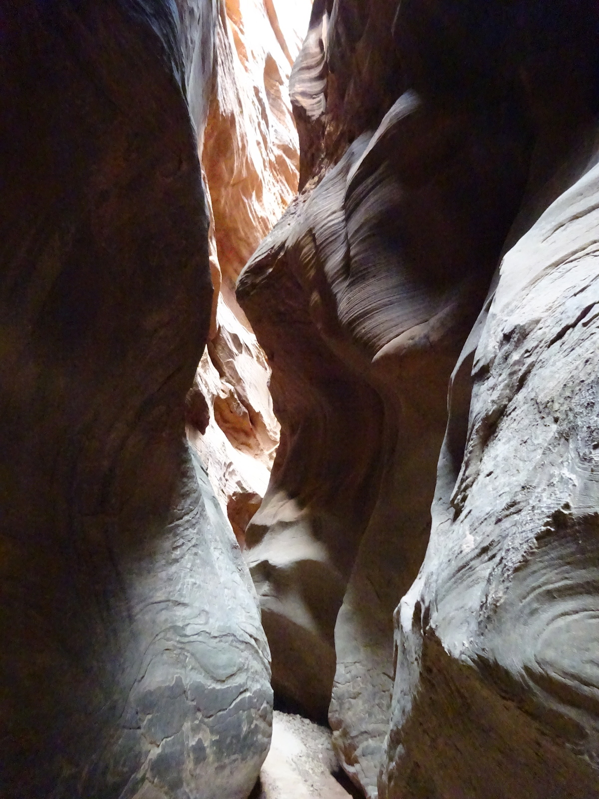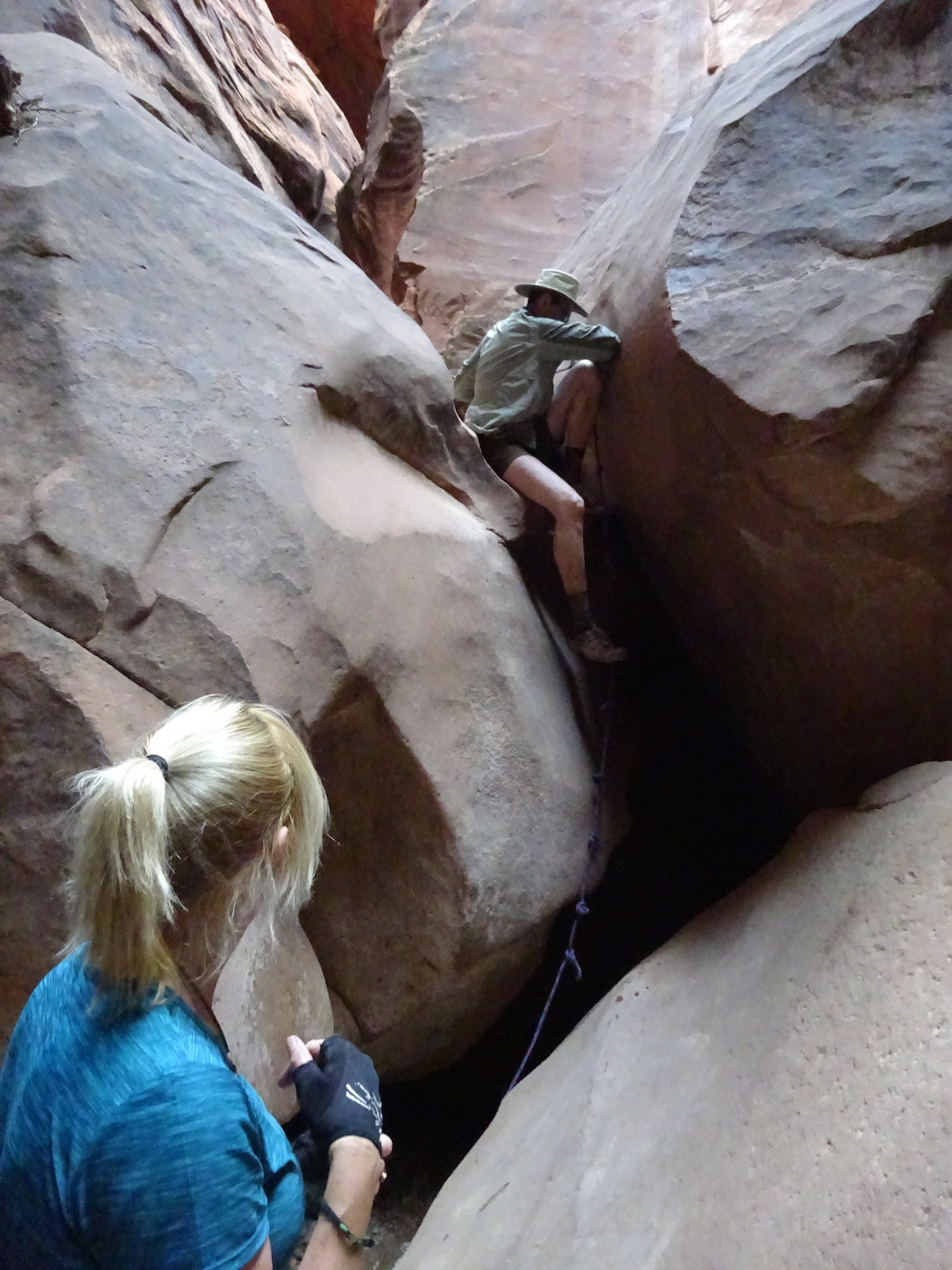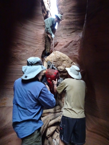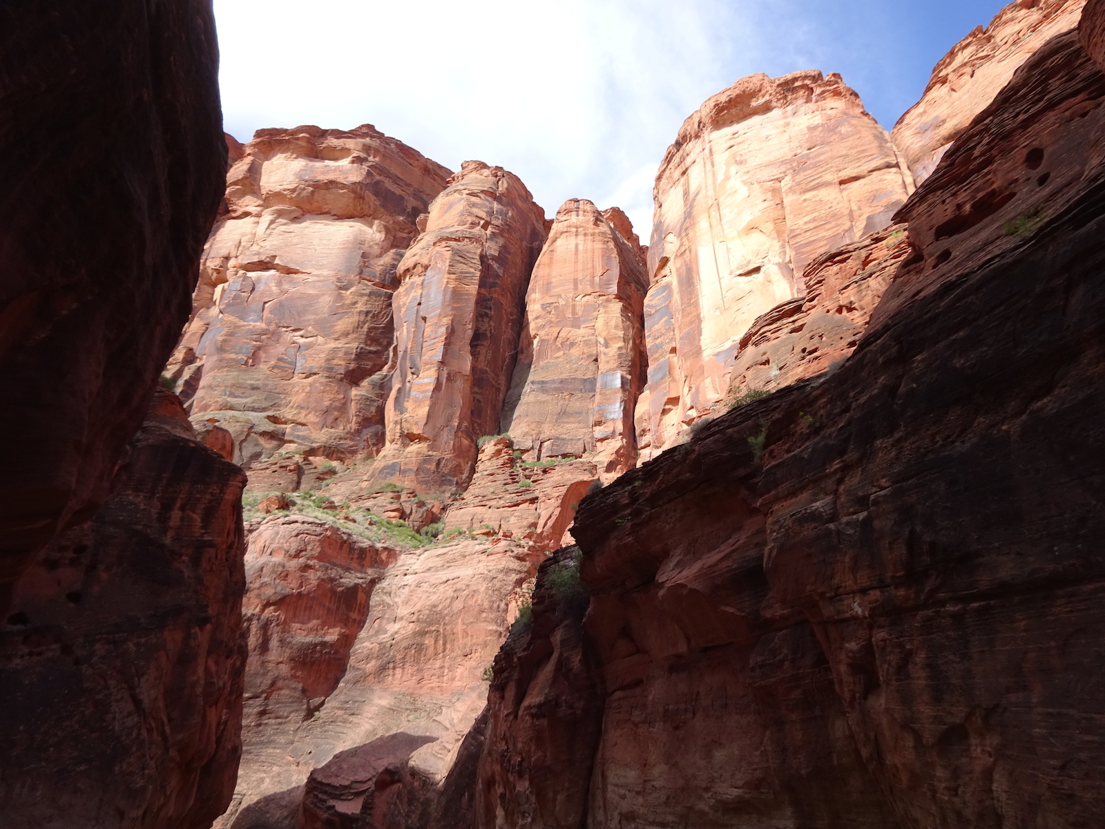 There were a few exit/escape places in Buckskin Gulch. This was the only one that looked like we could climb. Hiking in this canyon would be very dangerous if there were a flash flood. You have to make sure there is no weather anywhere around. Even many miles away a storm would be dangerous because it would have time to gather up more water and debris to fill the slot. There were no storms in the weather forecast for this day.