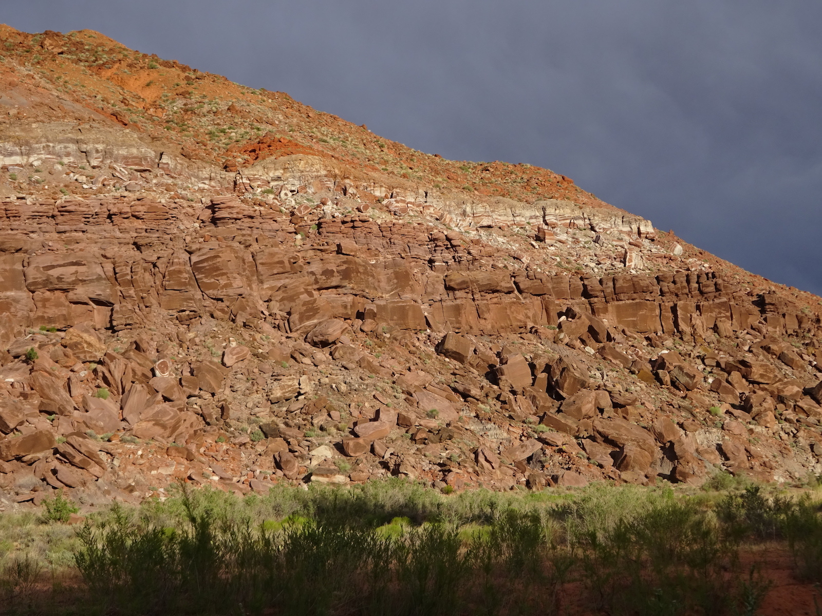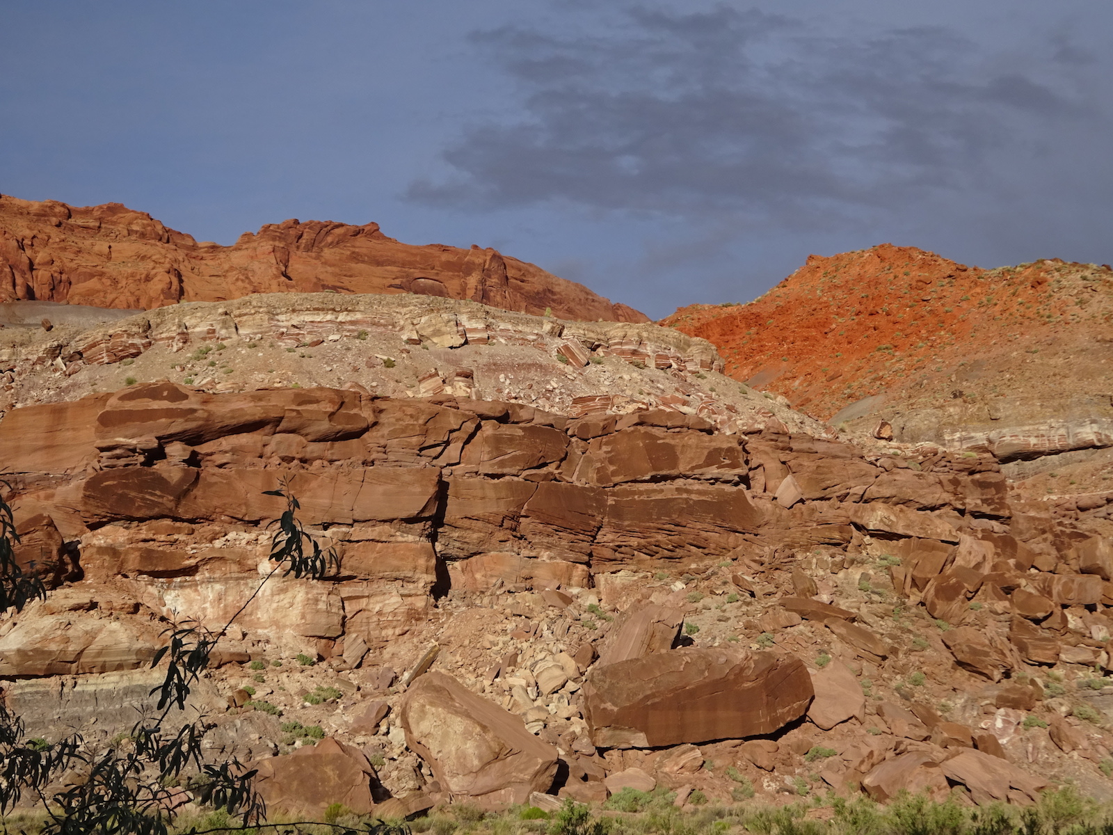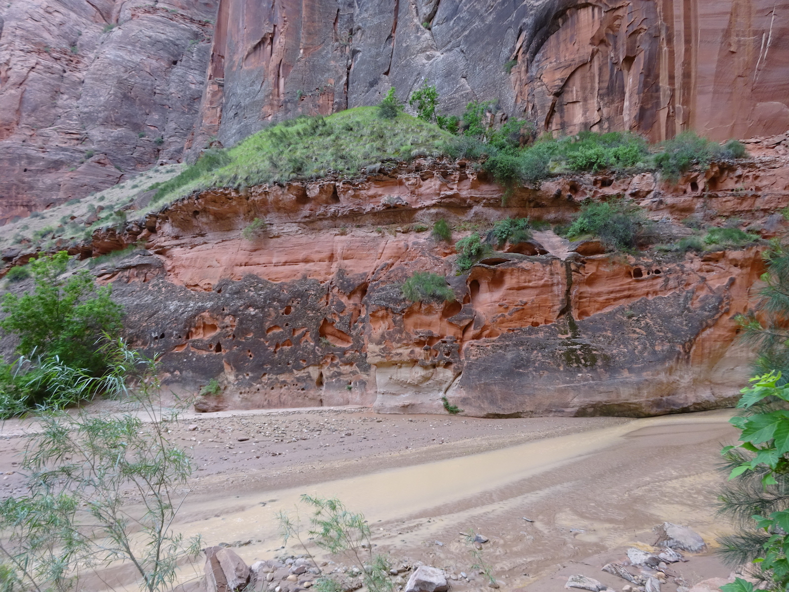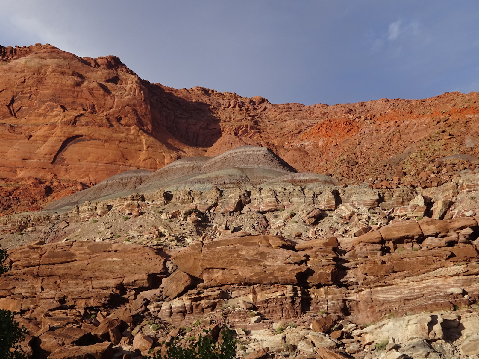 I marveled at the chocolate and vanilla layers in the broken cube boulders across the river. We were now out of the Navajo sandstone and into other rock formations of this region. The first one after the Navajo was the Kayenta, but I'm not sure if this weird painted desert kind of thing was the Kayenta or one of the other layers further down the layers. My little map didn't go far enough and I don't remember all the layers from my geology days anymore.