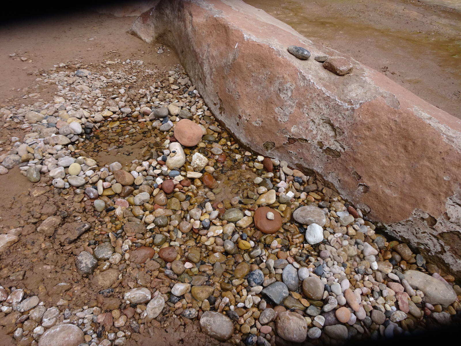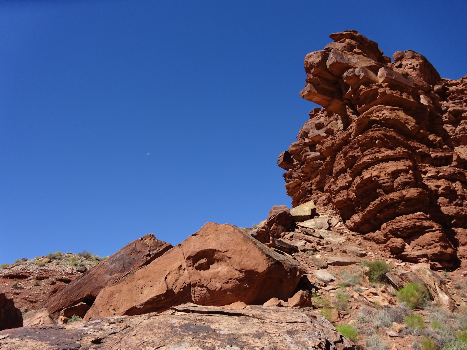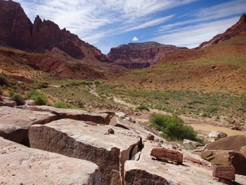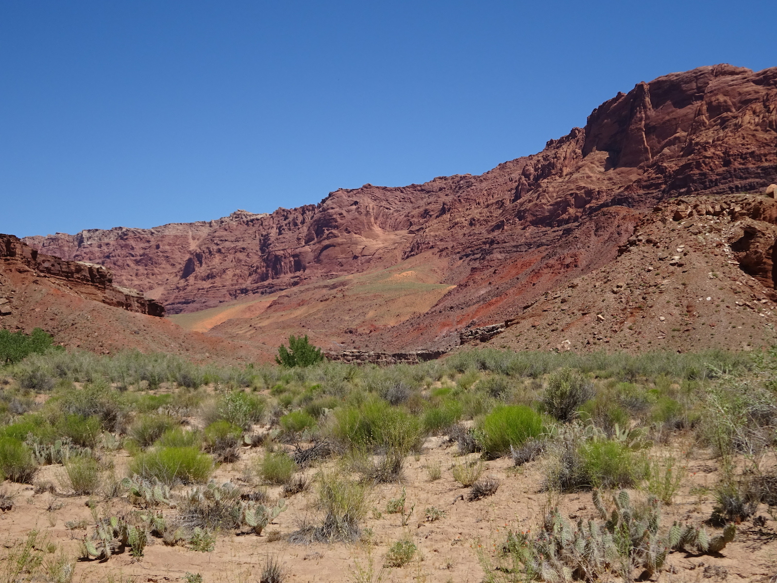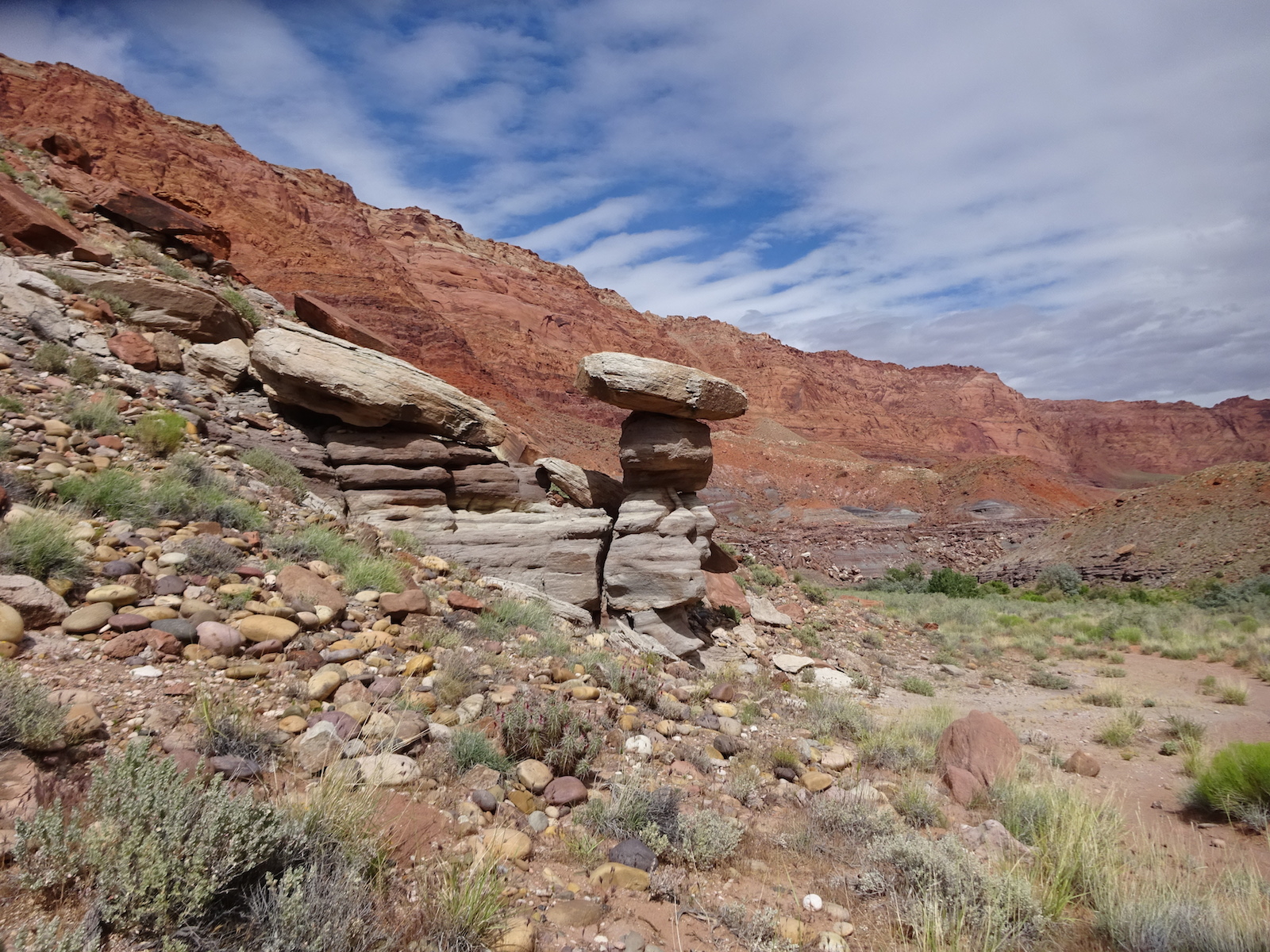 I marveled at the chocolate and vanilla layers in the broken cube boulders across the river. We were now out of the Navajo sandstone and into other rock formations of this region. The first one after the Navajo was the Kayenta, but I'm not sure if this weird painted desert kind of thing was the Kayenta or one of the other layers further down the layers. My little map didn't go far enough and I don't remember all the layers from my geology days anymore.