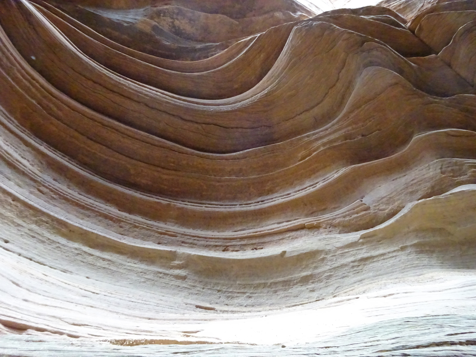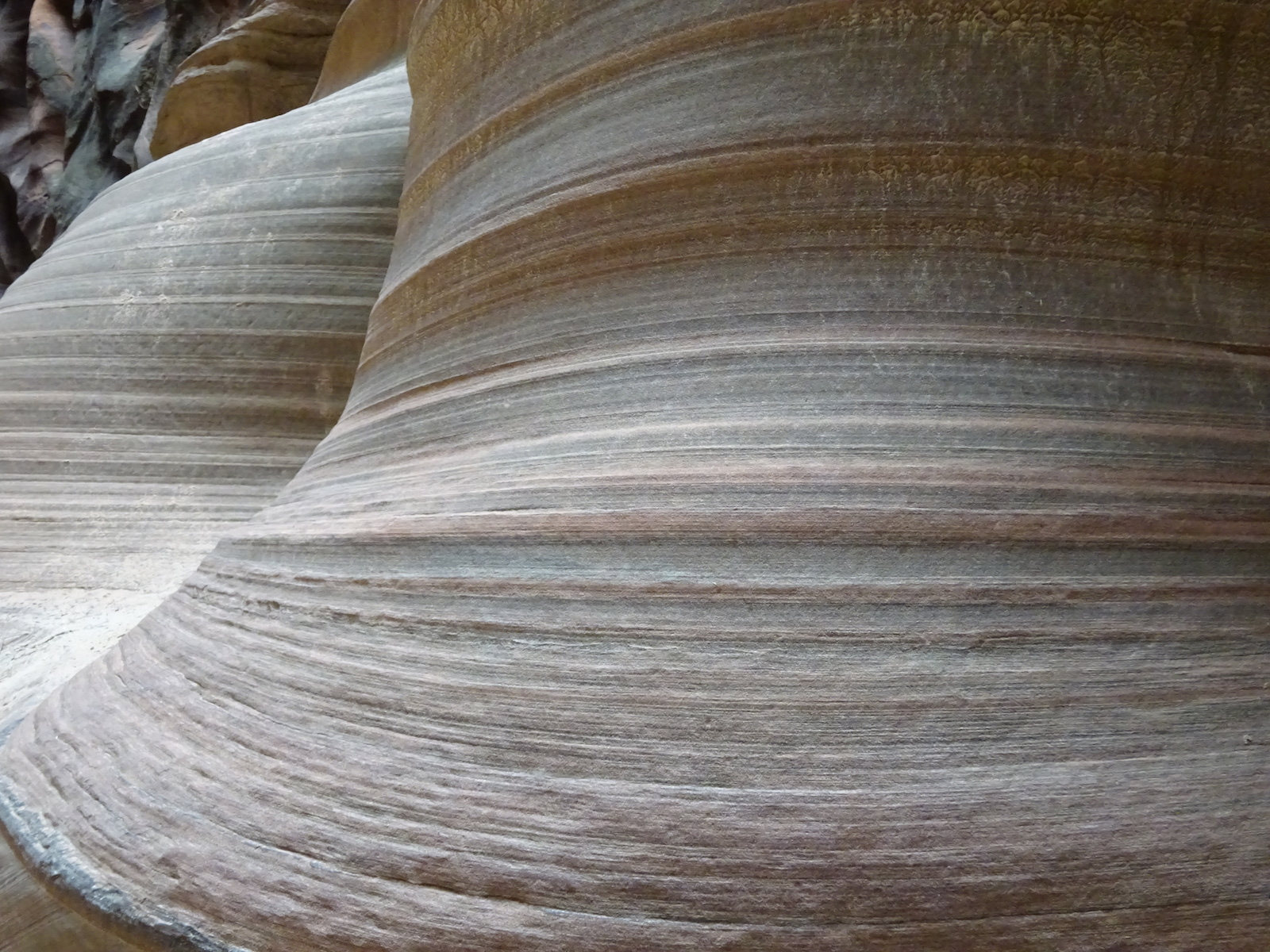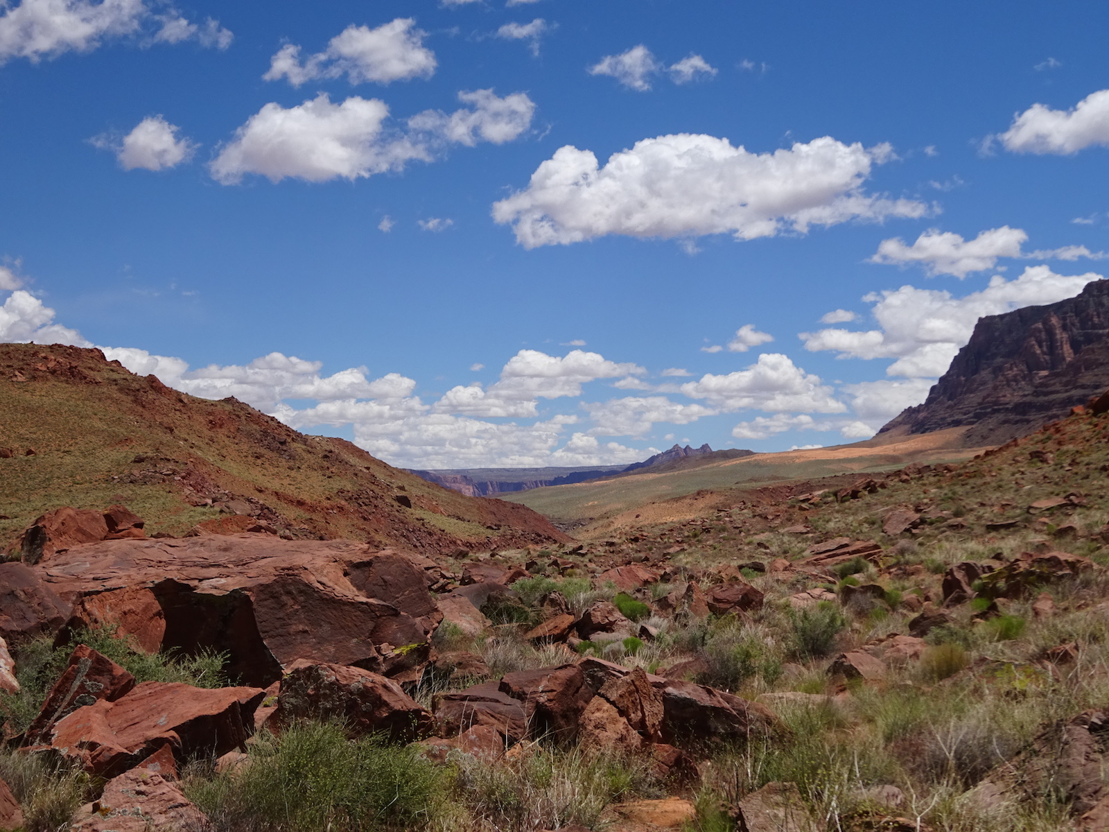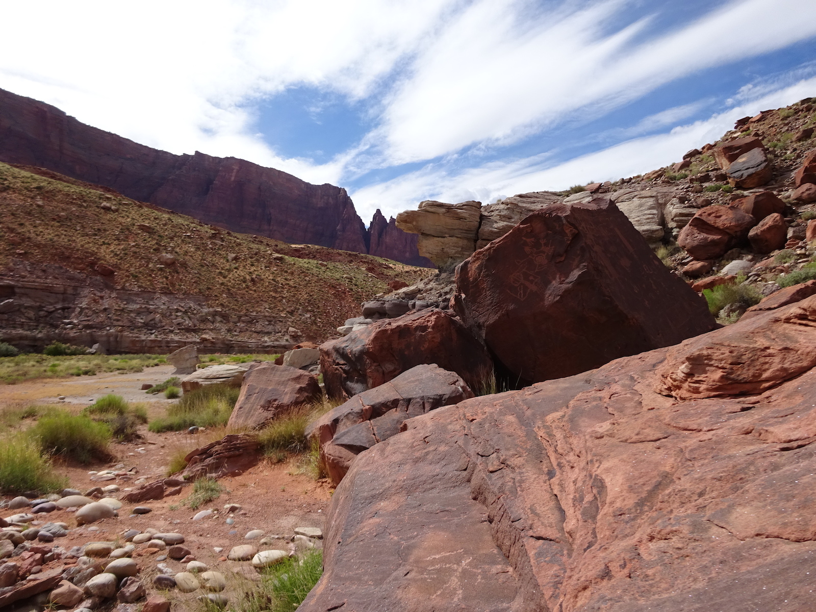 I marveled at the chocolate and vanilla layers in the broken cube boulders across the river. We were now out of the Navajo sandstone and into other rock formations of this region. The first one after the Navajo was the Kayenta, but I'm not sure if this weird painted desert kind of thing was the Kayenta or one of the other layers further down the layers. My little map didn't go far enough and I don't remember all the layers from my geology days anymore.