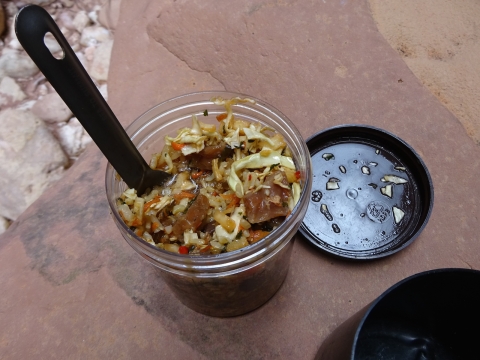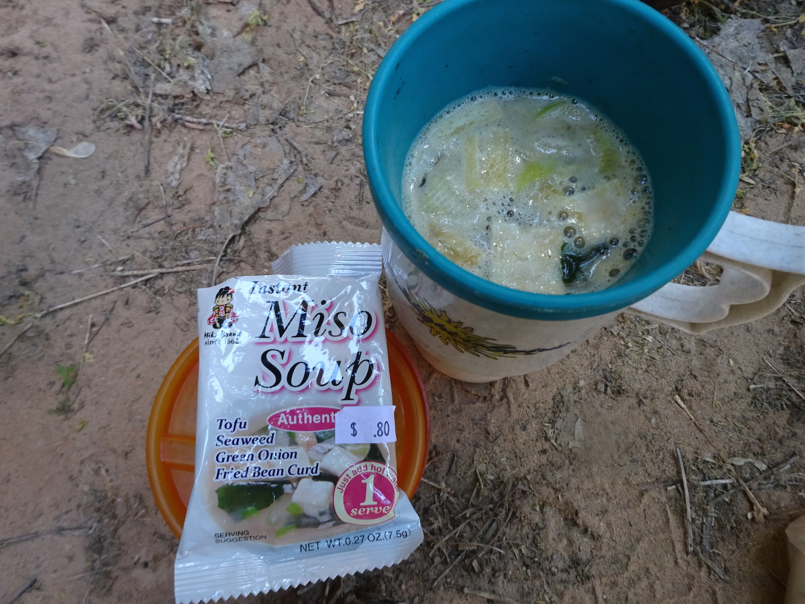 We found a wonderful campsite. The most beautiful campsite. I made some Miso soup. This soup was so good. It rehydrated up as if it was completely fresh, like magic, with three little cubes of tofu, onions, wakame and little chunks of something that seemed like egg. I would definitely buy this again, not just for backpacking but for eating at work. Tastes exactly like what you get in a restaurant. I bought this at Nikka in Goleta.