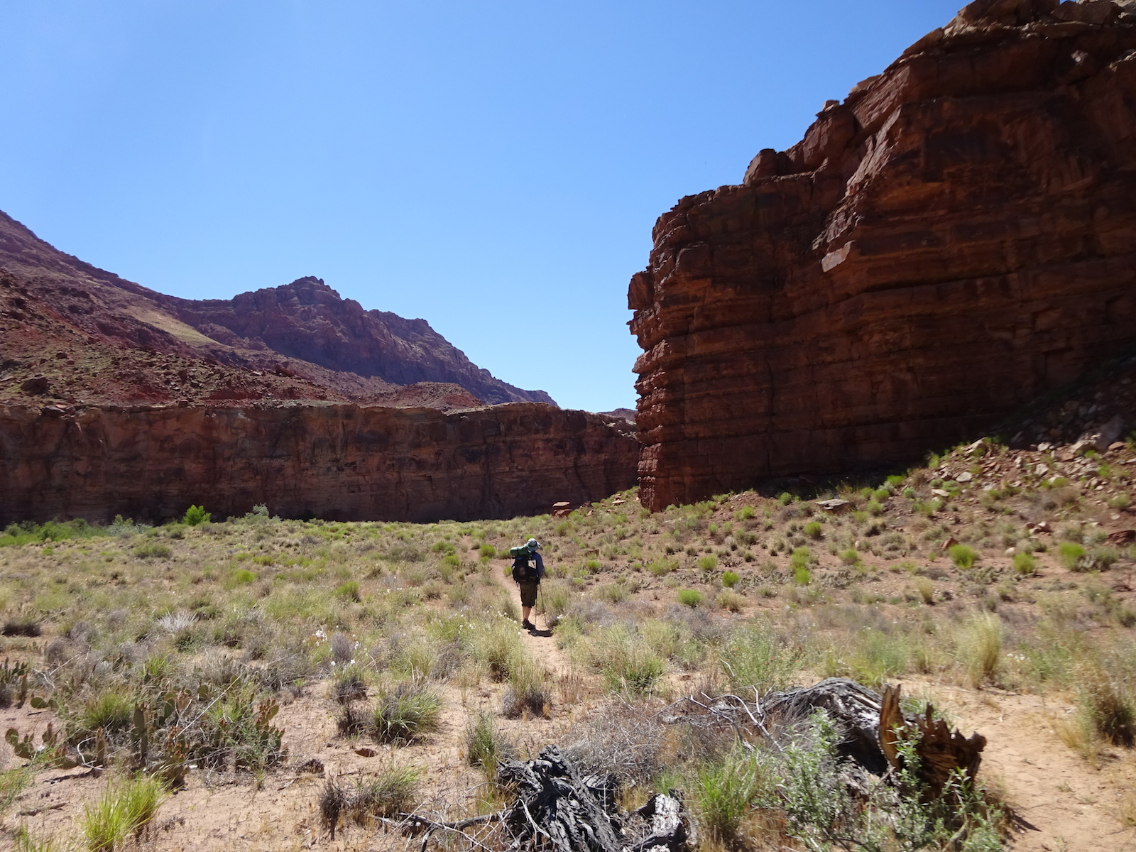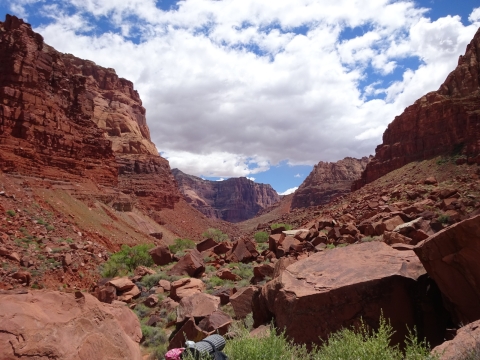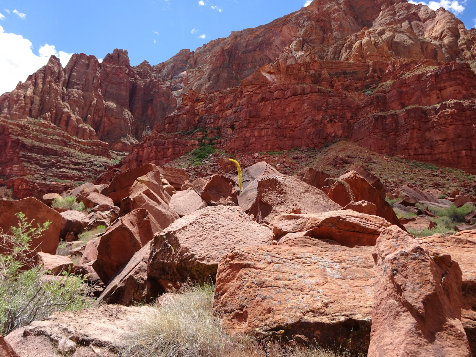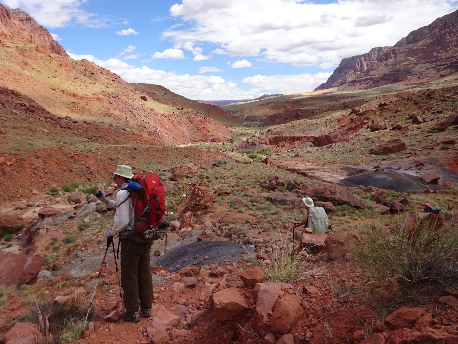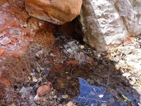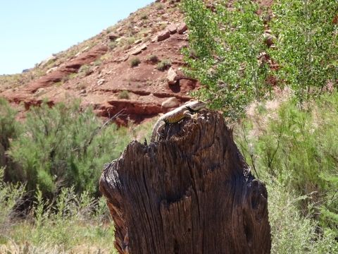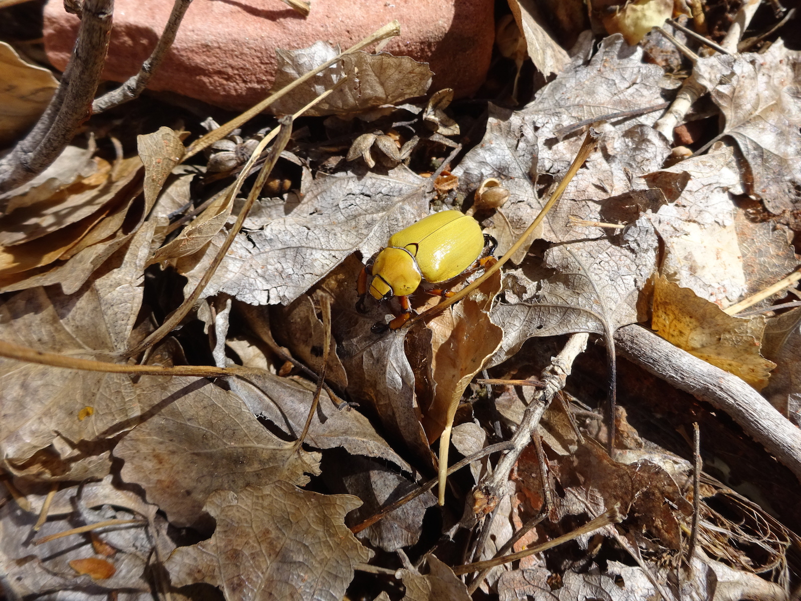 We hiked on a ways and stopped for a rest break at an old ranch site and learned that we had passed all the reliable water for the whole rest of the trip! Fortunately, where we rested there was a little canyon. I walked a small distance up the canyon and found a small stream. And this yellow beetle.