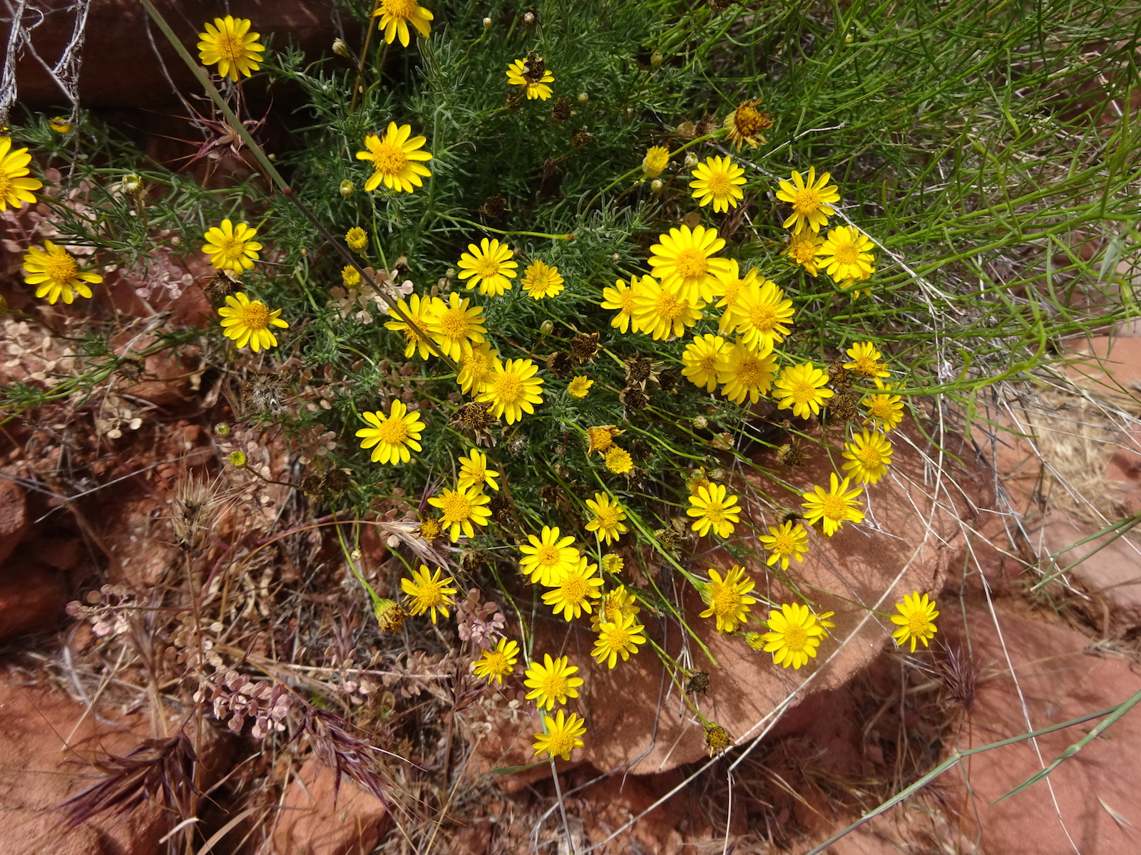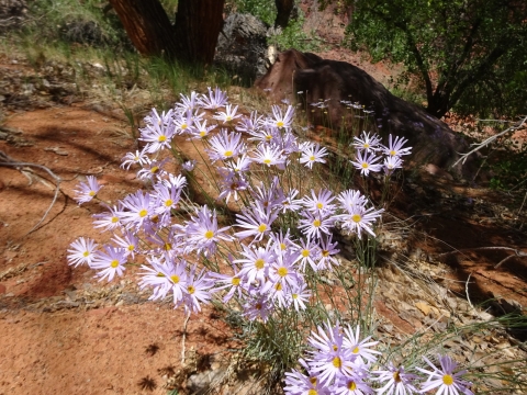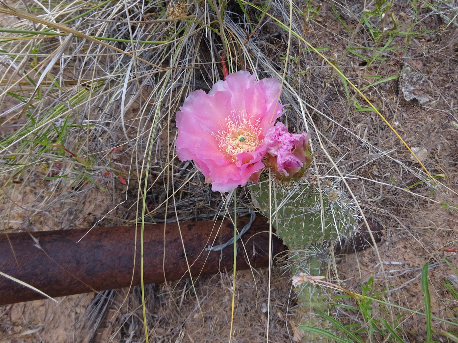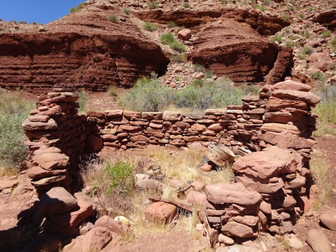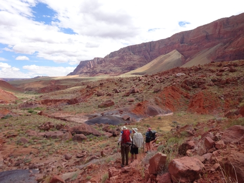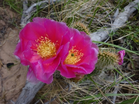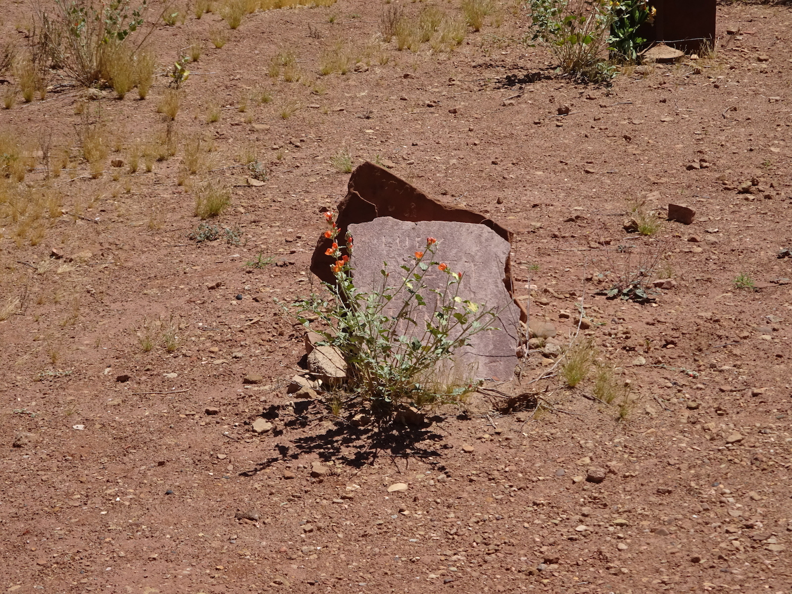 We hiked on a ways and stopped for a rest break at an old ranch site and learned that we had passed all the reliable water for the whole rest of the trip! Fortunately, where we rested there was a little canyon. I walked a small distance up the canyon and found a small stream. And this yellow beetle.