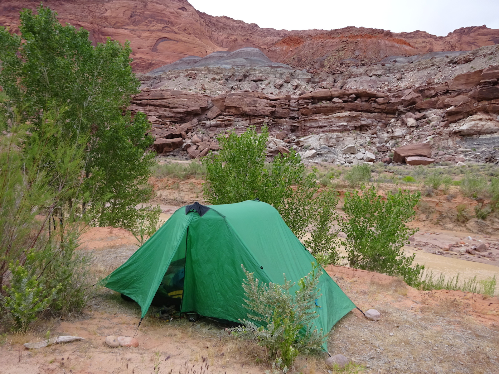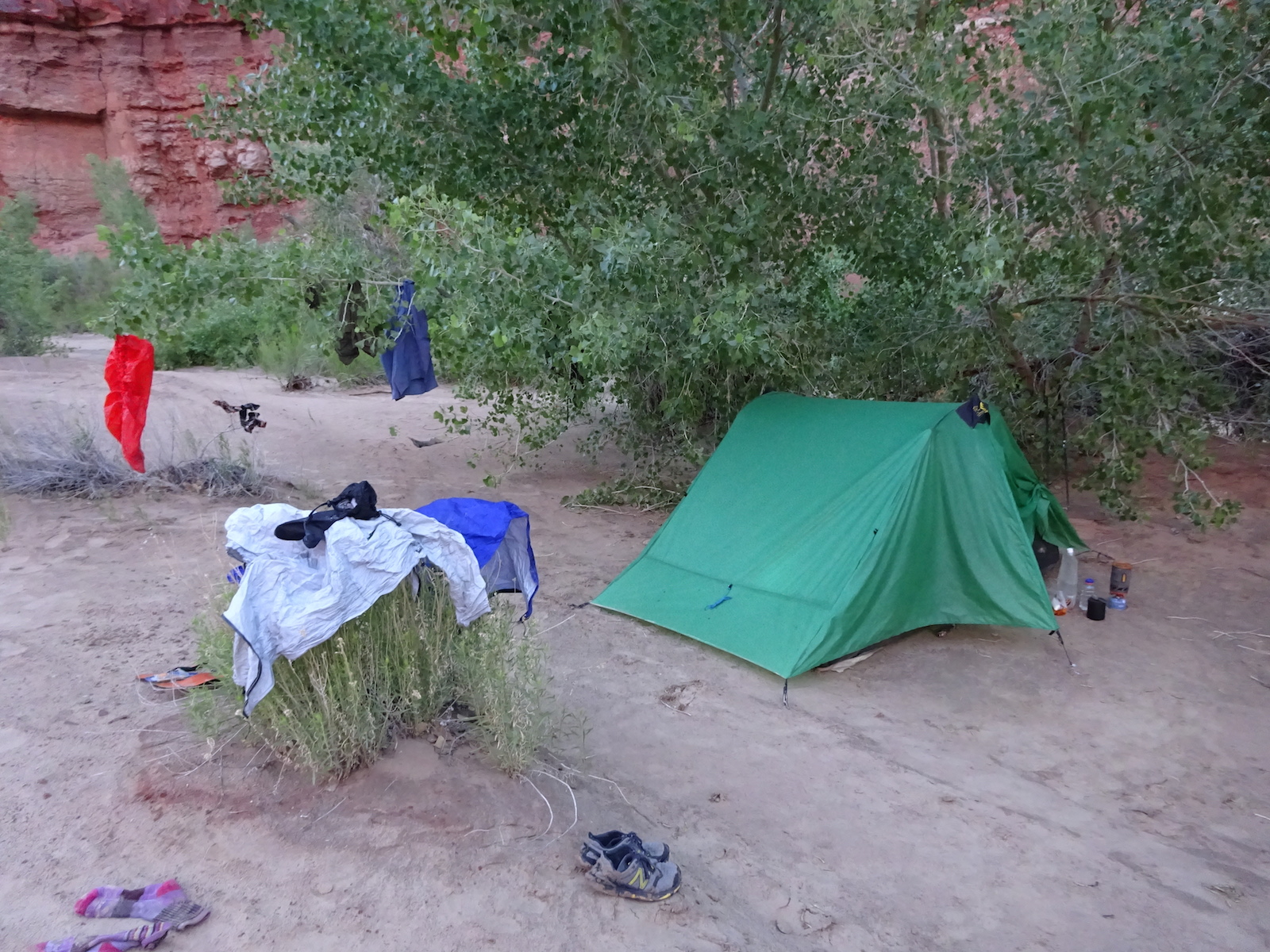 The view of the river from our campsite. I took some time to rinse the sand out of my socks in this sandy river. It helped, although it wasn't completely successful. It seemed that the river sand impregnated your socks. If you could get the socks dried overnight, you could spend a half an hour just turning them inside and out, releasing another teaspoon of sand with each turn.