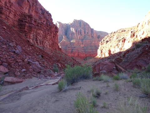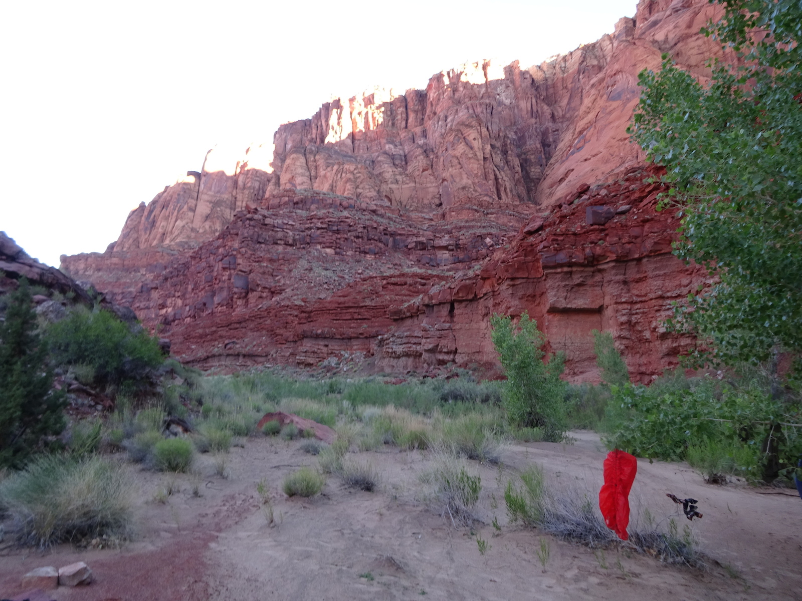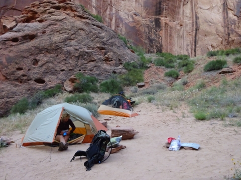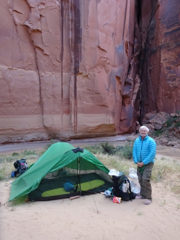 After about another hour or so we found a nice knoll with a couple of great campsites. Tony and I felt pretty darned exhausted. We went to sleep after dinner before it was even dark yet. I slept so well on this trip, better than I do at home. Probably because there were no orange lunatics to worry about. Just orange cliffs and us lunatics.