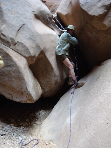 Now we had to do a scary down climb. I am not a rock climber. I totally chickened out and almost cried. There were three ways down. One had vertical steps carved in the wall. Nobody thought they could do it. The center one had ropes already tied and people thought that looked easiest. I thought it looked impossible. A third passage made you land in a mud puddle. I thought it looked more doable. I didn't get pictures of myself doing that, of course. I'm sure I looked like a giant sack of