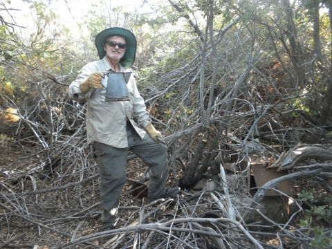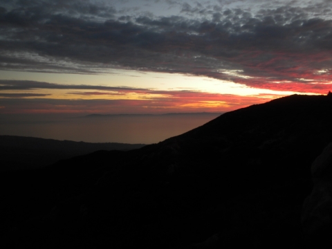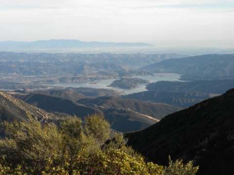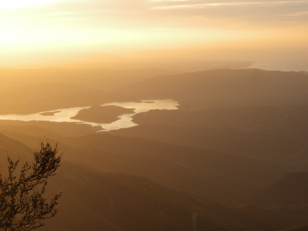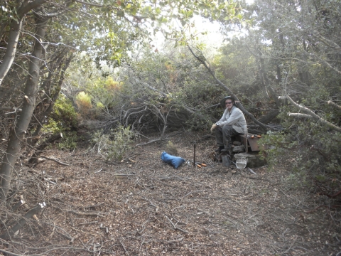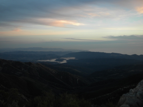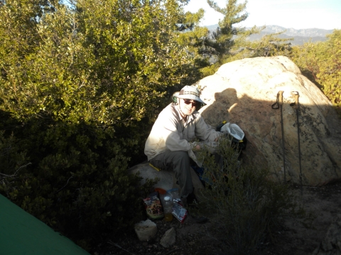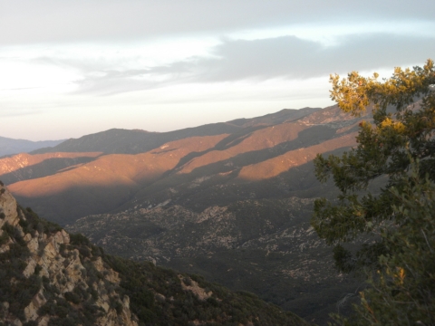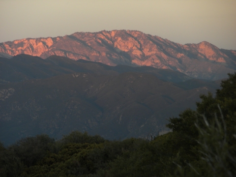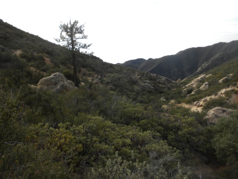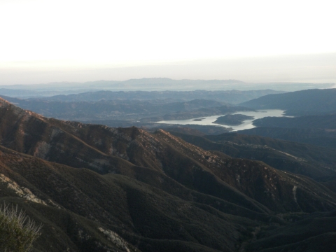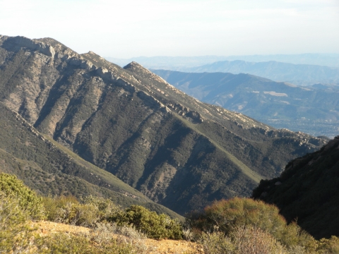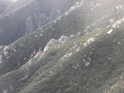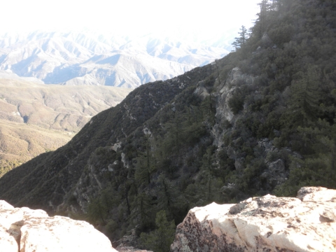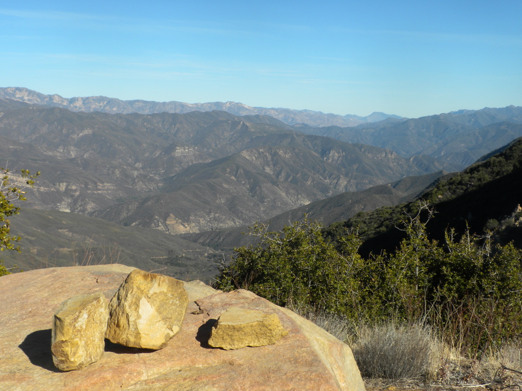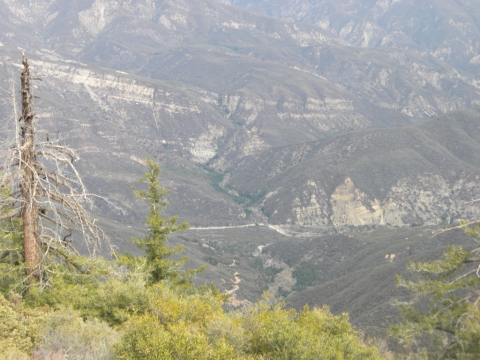 We went out to the trail and did a little cutting to connect the campsite to the rest of the trail work. The trail has gotten quite far now. This is looking down toward Matillija. You can see the Divide Peak road on the left as it goes down to join the Matillija road. The canyon full of trees parallel to the dirt road is where the Murrietta camp is and the canyon going up from Matillija road is Matillija Canyon.