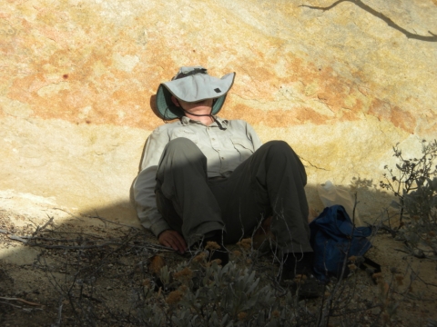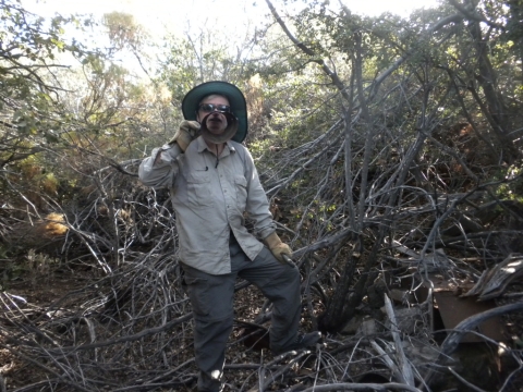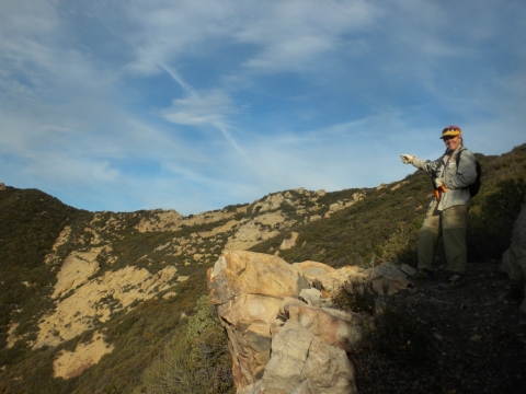 Here I am doing one of those Beeman pointing things. I'm not really pointing at anything in particular. This is the spot where there's an old picture of a man on a mule back when this really was a trail. A bunch of intrepid people have been steadily trying to open this trail back up. It's been hit and miss as far as keeping strictly to it, but this spot is for certain the old trail.