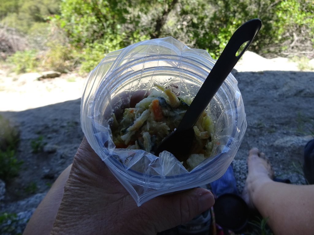 I stopped for lunch. I put butter in my cold, reconsituted meat and potatoes. The hiker hunger was starting to hit me and I hoped higher calories and lots of fat and protein would keep it away.