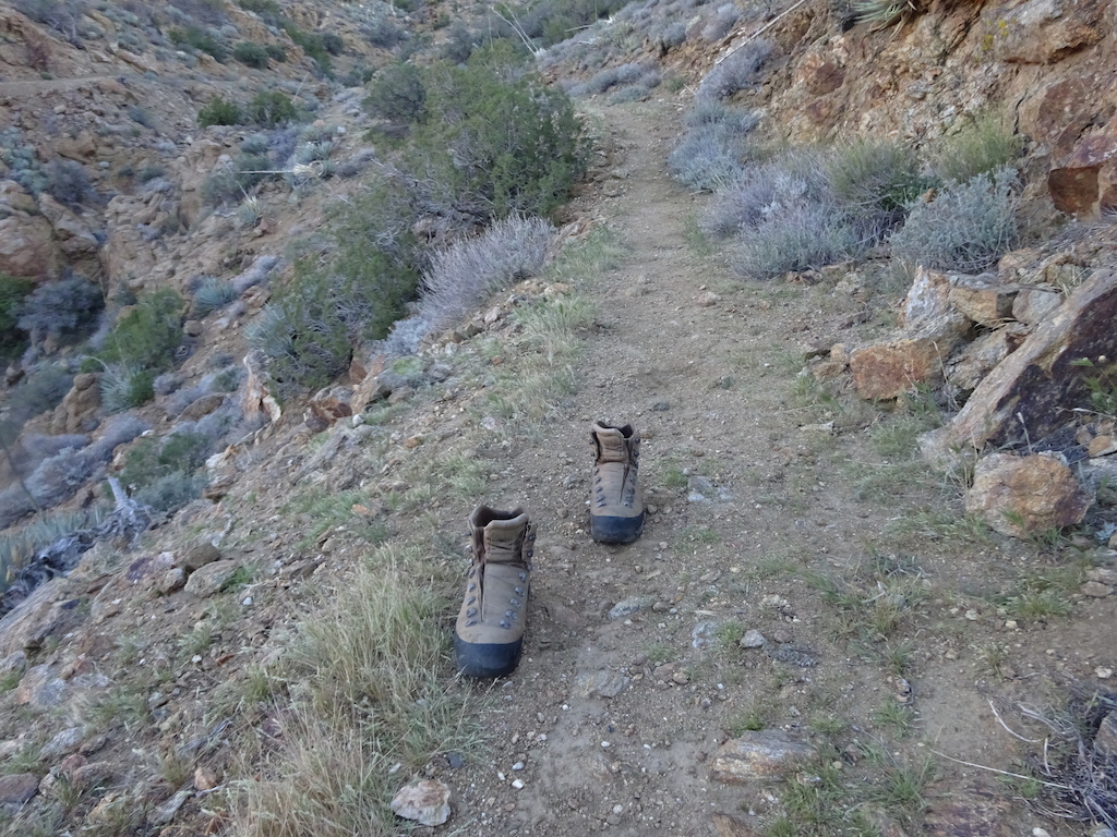 I came upon these heavy boots arranged in the trail like a hiking ghost. I thought about it a bit and decided to pack them out. They were quite heavy, a woman's size 7 and about 4lbs total.