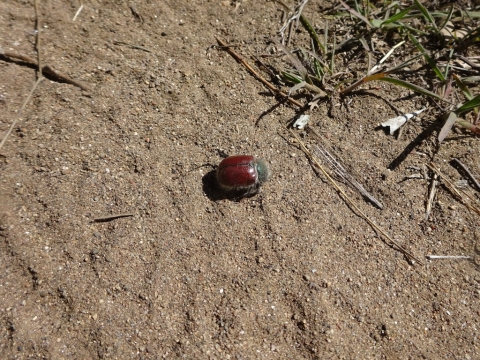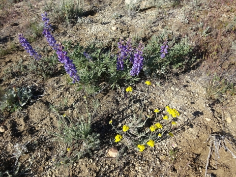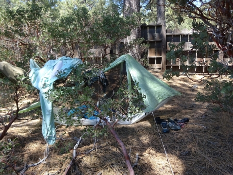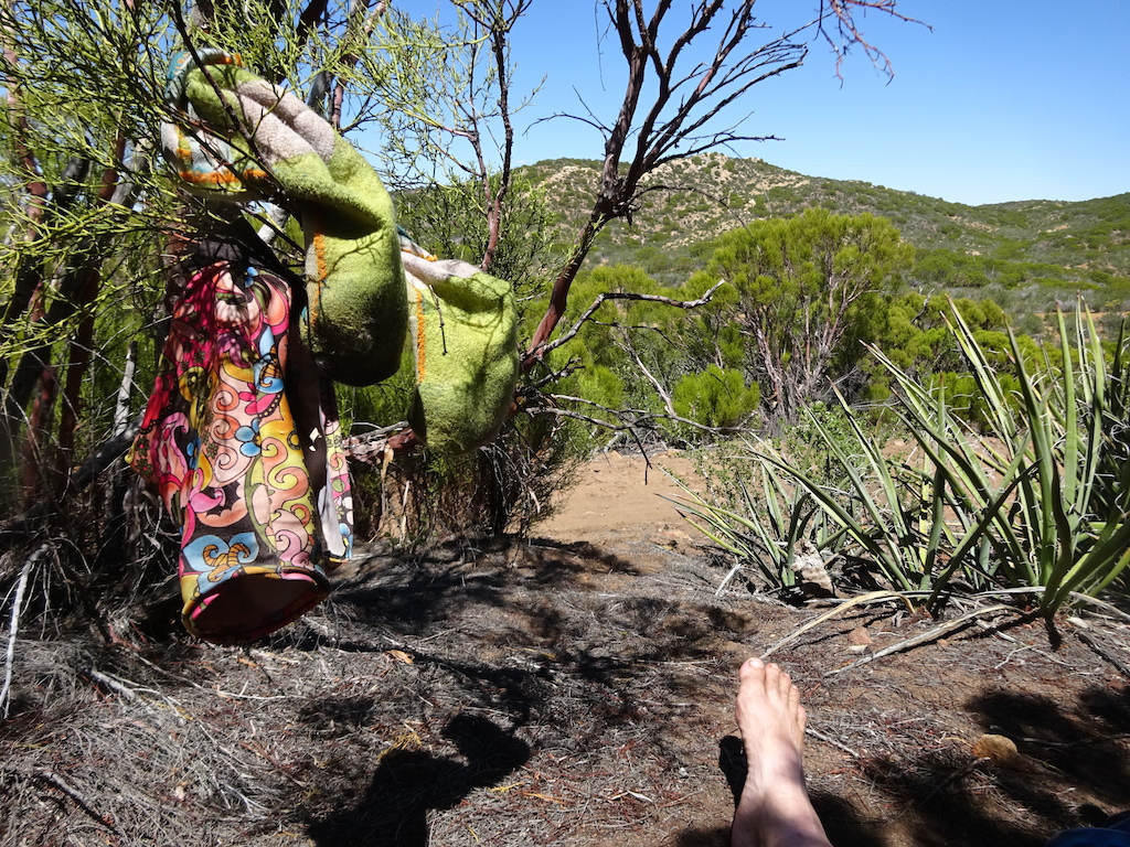 I didn't get a picture, but down in the flats I see a blue shirt coming my way with a familiar gait. It's Tony! He's come to meet me out in the desert on the worst part of the entire trail, bless his heart. He brought me ice water. It was well-recieved. I was surprised how this hot heat was making me thirsty. We hiked together back toward Ziggy and the Bear. I convinced him that if I walked to Ziggy and the Bear's they might be kinder to me and treat me like a regular hiker, let me wash up.<