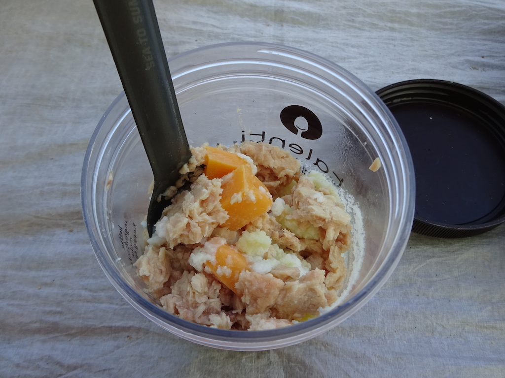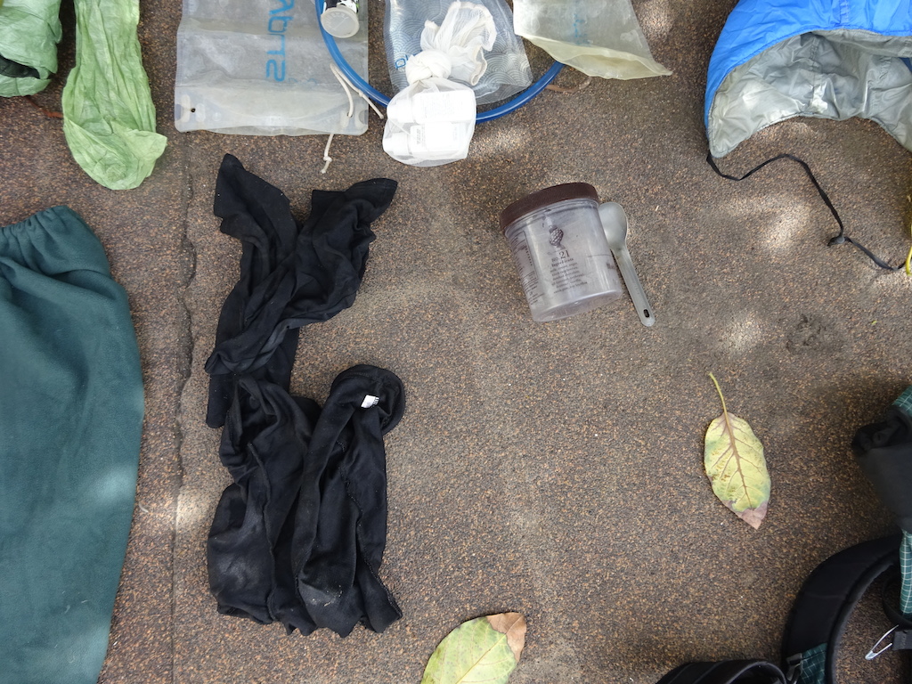 - Titanium spoon. A short one that fits in my cookpot, which I sent home due to blowing up my stove. It also fits in the plastic jar.