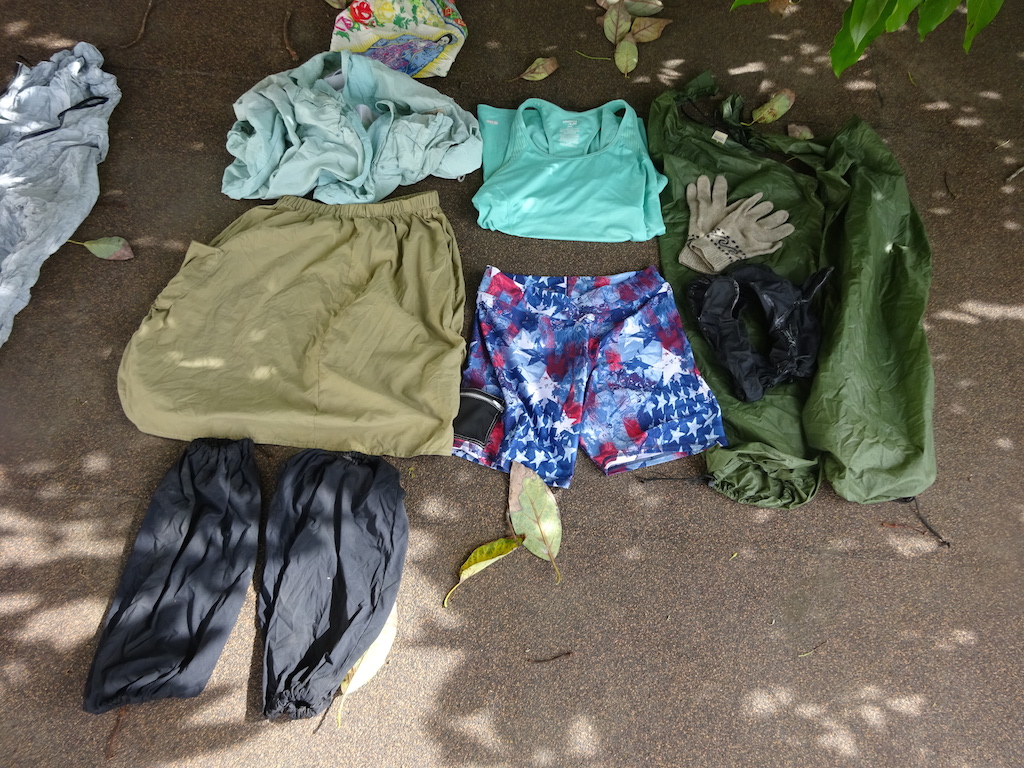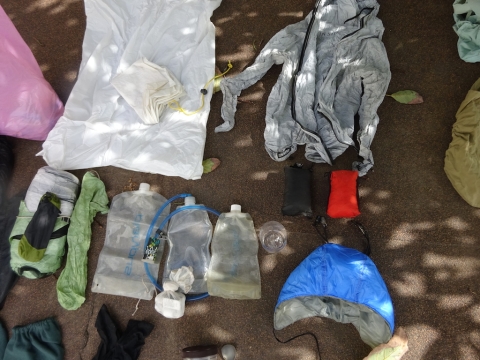 - Homemade nylon hiking skirt. Has one big pocket on the side. Wished it had a zippered pocket but I ran out of fabric. This was my favorite piece of gear. Went full Scotsman underneath and was never more comfortable. It is knee length to protect from