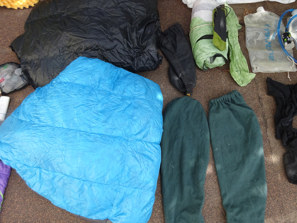 - To the right of the compactor bags is my Zpacks cuben fiber rain jacket. I wore this all the time for warmth.