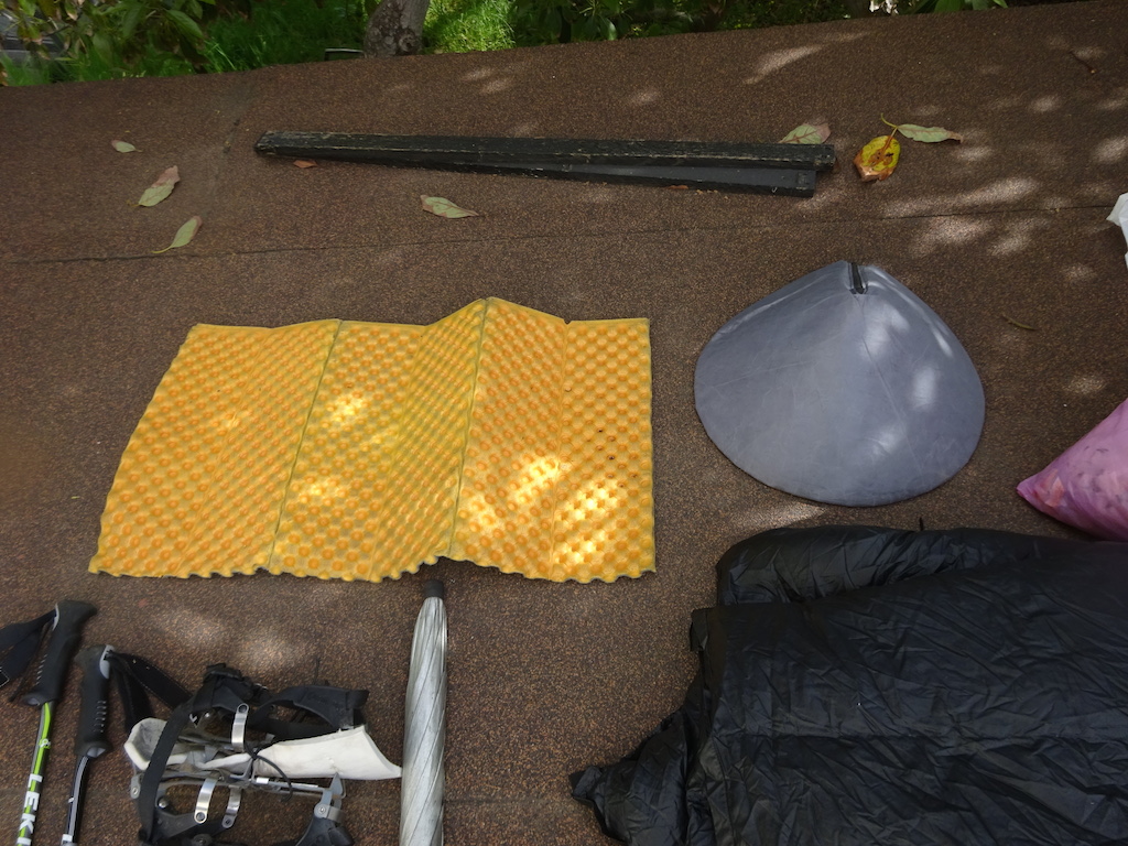 - Thing above my shoes: Crampons (with a piece of foam under the spikes to keep from stabbing things while stowed.) I love my crampons. Maybe I will get a tattoo of them.