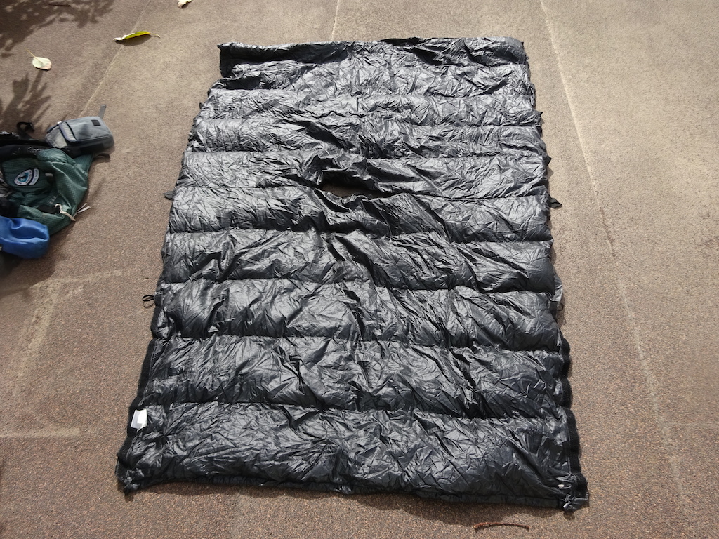 Here's a better picture of my Jacks R Better quilt. There's a hole in the center you can stick your head through so you can wear it like a poncho. I did not carry a down jacket and used this instead. This is how I used it: