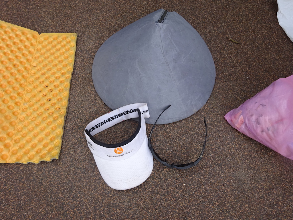- The gray conical thing is my Zpacks pointy hat. This hat was awesome. You clip it to a visor or ball cap. There's a chin strap which I modified to be more secure. I wore it with a visor which allowed the breeze to cool my head under the hat. It could securely withstand fairly high winds. At night I would unzip it and it would lay flat, giving me extra padding under my shoulder and for a pillow.