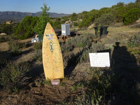 At the community of Snow Creek, a community that is rumored to not be PCT hiker-friendly, there's this sign with all these PCT landmarks on it. Next to the sign is a house with a PCT sticker and a sherrif's star on the mailbox. I think maybe this is a secret trail angel or perhaps someone who can help you if you are in trouble.