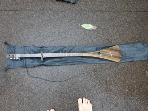 My strumstick, with a homemade bag I made for it. I used a capo because this thing is really long and I can barely reach the upper notes. The instrument is basically a dulcimer. It has a diatonic fretboard, not chromatic like a guitar. That means Do Re Me Fa So La Ti Do with none of the half tones in between. You tune it 1-5-1. It was my heaviest luxury item. Weighs about a pound. They make two versions that are much smaller. I wish I had the smallest one!