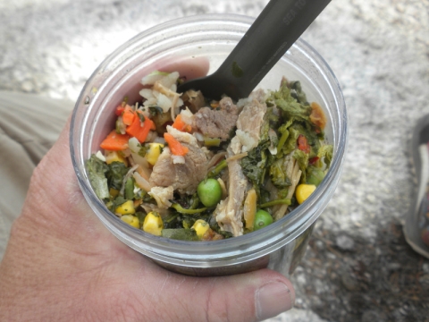 This dinner is actually not that tasty. It's dried pulled pork and various veggies like dehydrated cooked carrots, Just Veggies, dried
