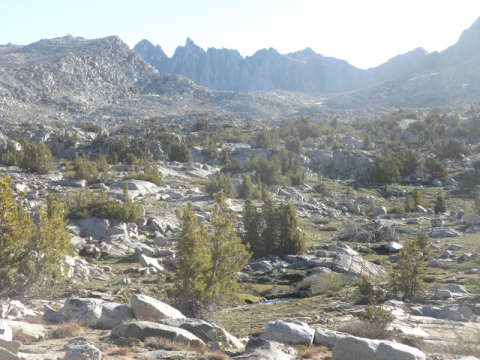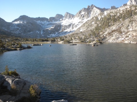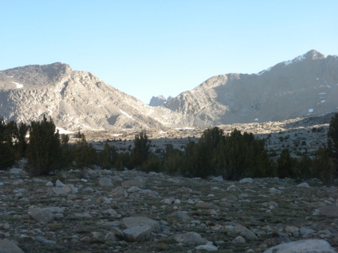 I woke up at the first sound of birds (probably 5:00AM) and made the final climb to Dusy Basin. I decided I would have breakfast up here by this nice lake. Man I was hungry! It was a lot further and a lot more strenuous to Dusy Basin than I expected. It was also extremely cold up here. I had to put on all my down and fleece just to have breakfast.