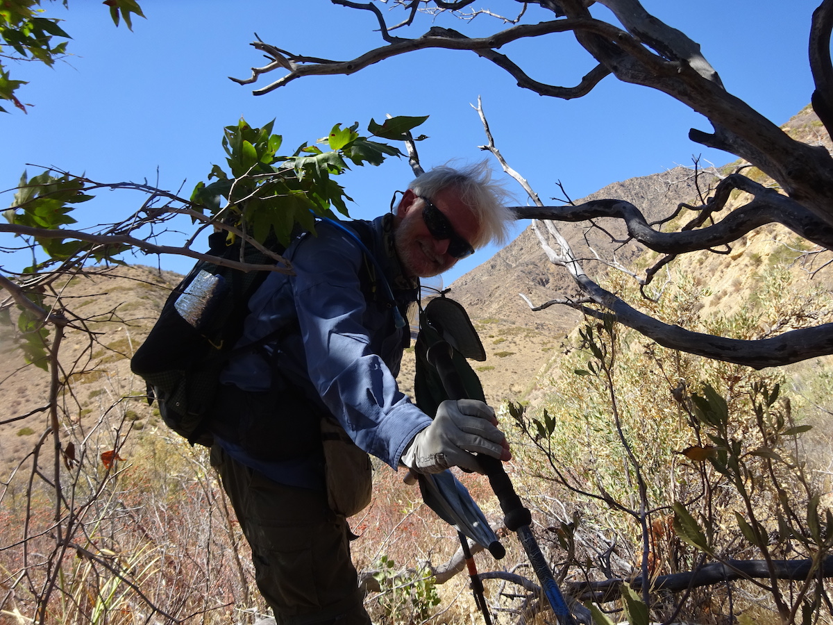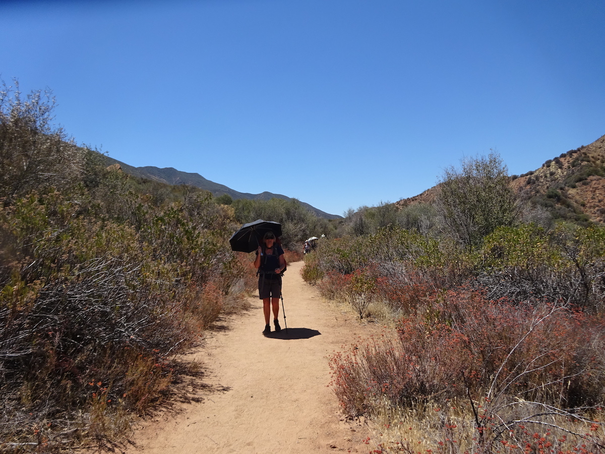 Tony took my picture with my scarf being used to keep the morning sun off my bare arms. Soon I would take off my pointy hat and launch my umbrella. I have one of those old Go-lite Chrome Dome umbrellas. I swear the difference under the umbrella was about 10 degrees, and keeping the sun off your skin was worth more than that. With the wet scarf around my neck and my clothes and head wet, the wind would blow on me while I was in the shade of my umbrella. This way the heat was tolerable. Go-lite