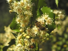 Prunus ilicifolia Grows all over in Chaparral, has edible cherries in early fall. Also called Holly-leaf cherry. sun, white |
