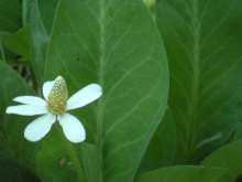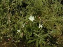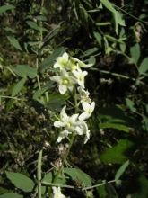 Marah macrocarpus Grows in shade. The leaves around these flowers are not the leaves of the plant. The leaves of the plant are shaped more like ivy leaves and have a sparkly, fuzzy quality. These vines have curly tendrils that reach out to allow the plant to climb all over everything. Blooms in early spring. shade, white |